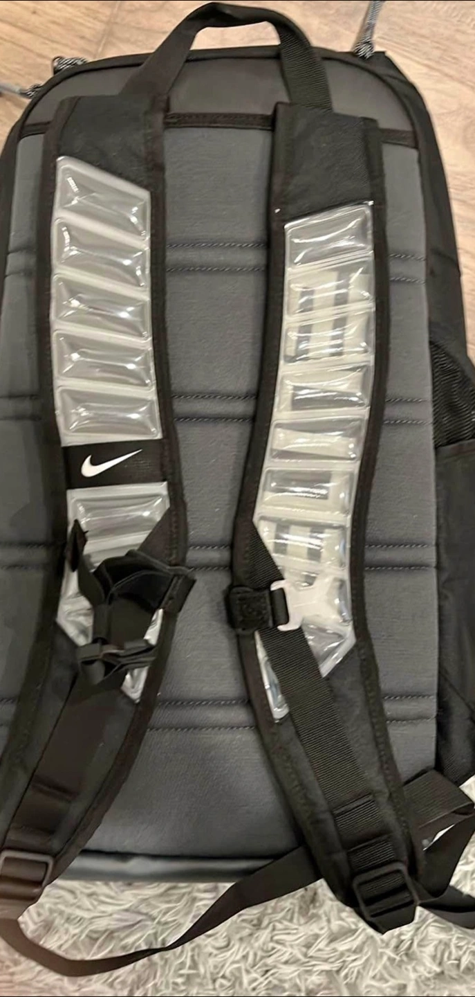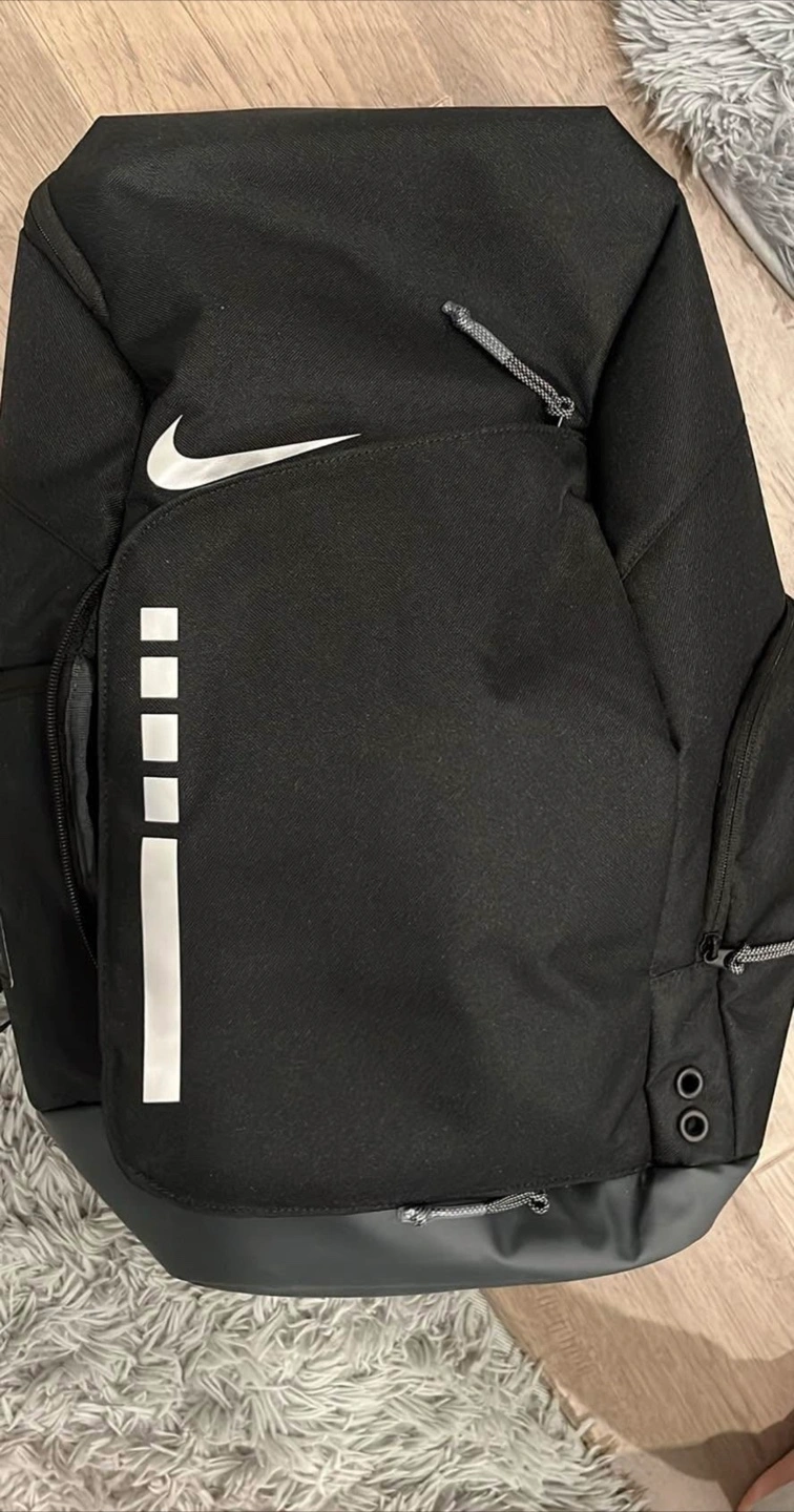 A black backpack. The main pocket area features a large flap. The backpack features a Nike logo. A great way to carry your belongings wherever you go.