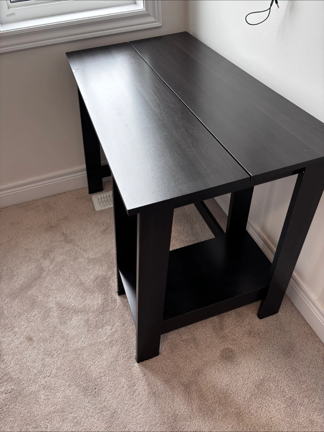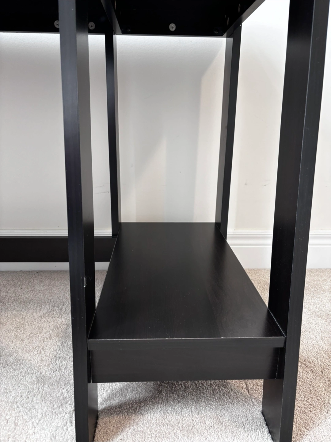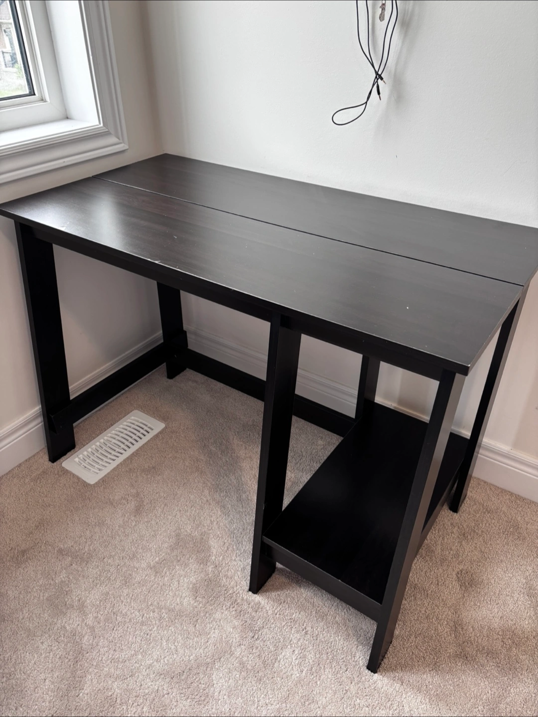 A wooden desk. Features a black finish. Includes a lower shelf for storage. This desk is the perfect size for getting your work done in a peaceful setting. Is used and has a few scratches plus tears.