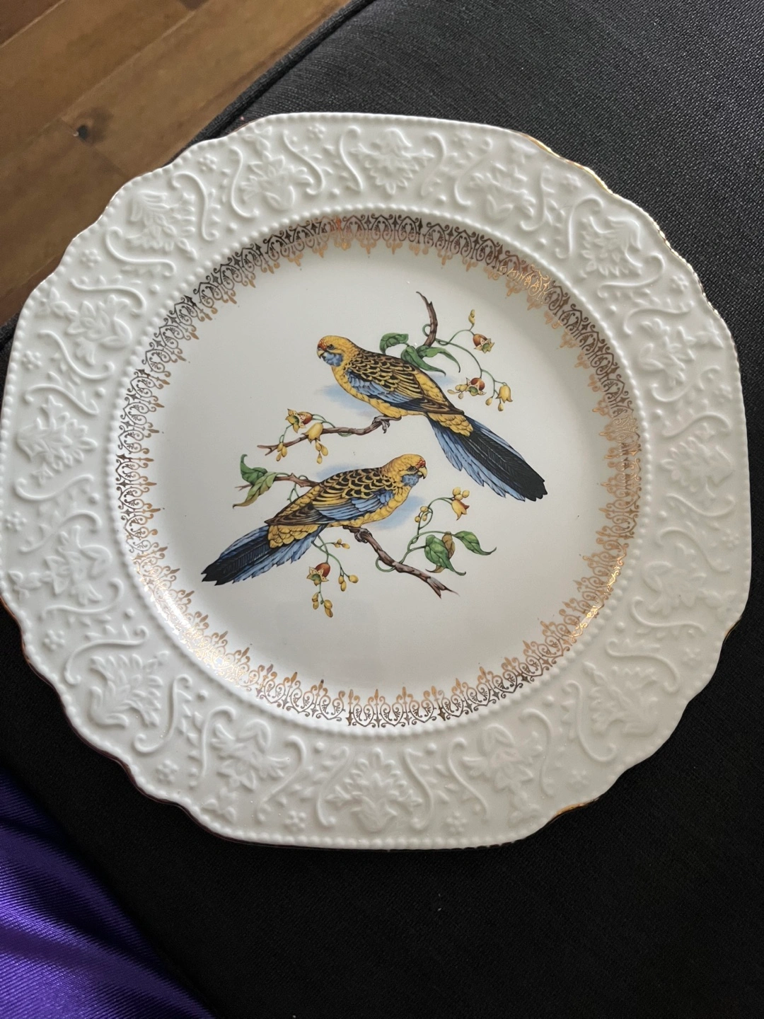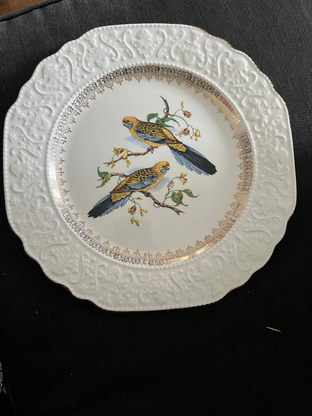 White plate with detailed gold trim. Beautiful embossed design around the edges. Features parakeets perched on branches from Stratford by wood & sons