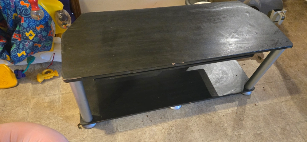 A black entertainment unit. Features a top shelf and an additional shelf below. Has silver legs. Perfect for a relaxing night of watching movies.