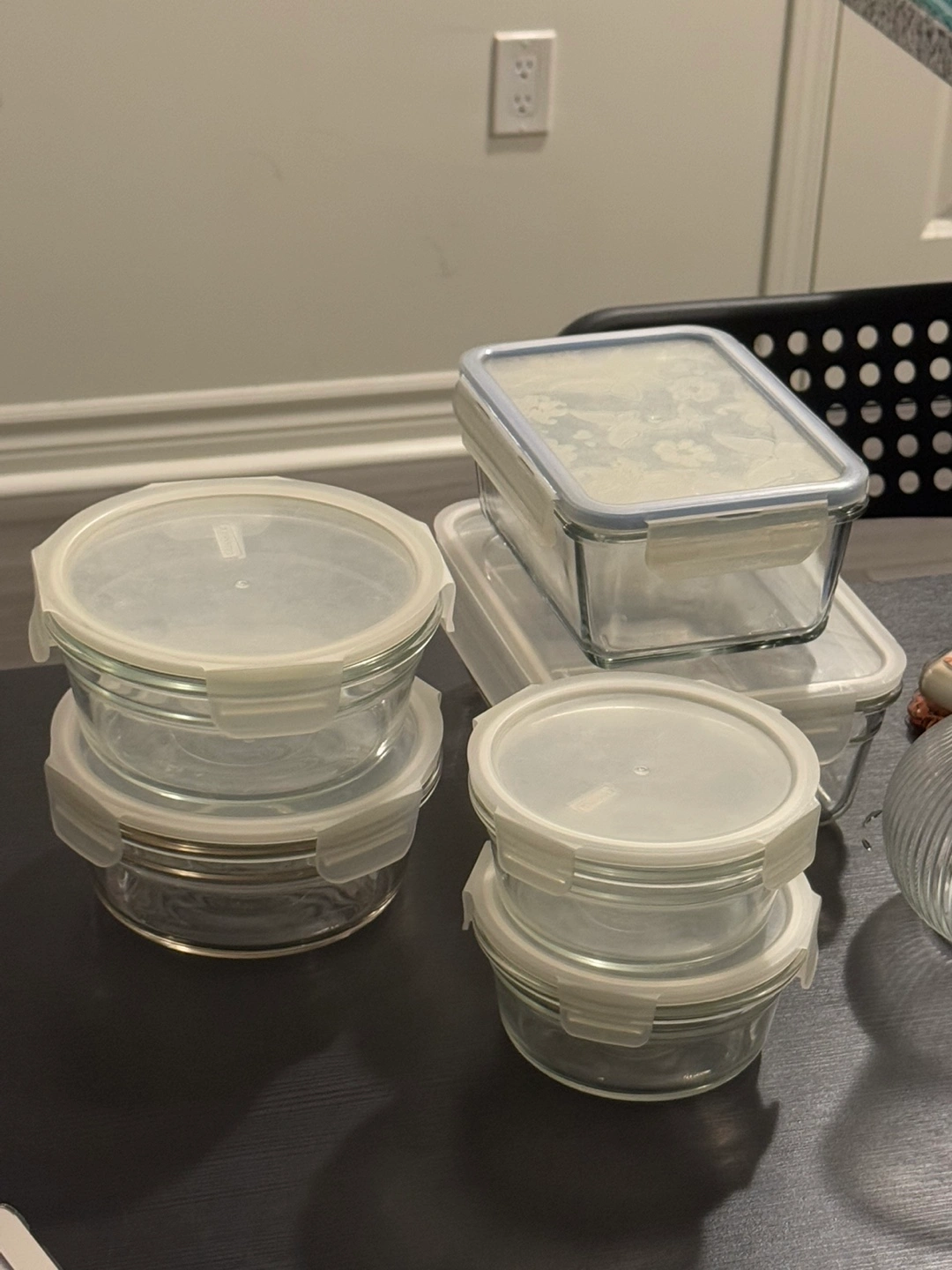 Multiple glass containers. White plastic lids. They're the perfect way to keep your food fresh. (Hold) ❗️ Food grade glass