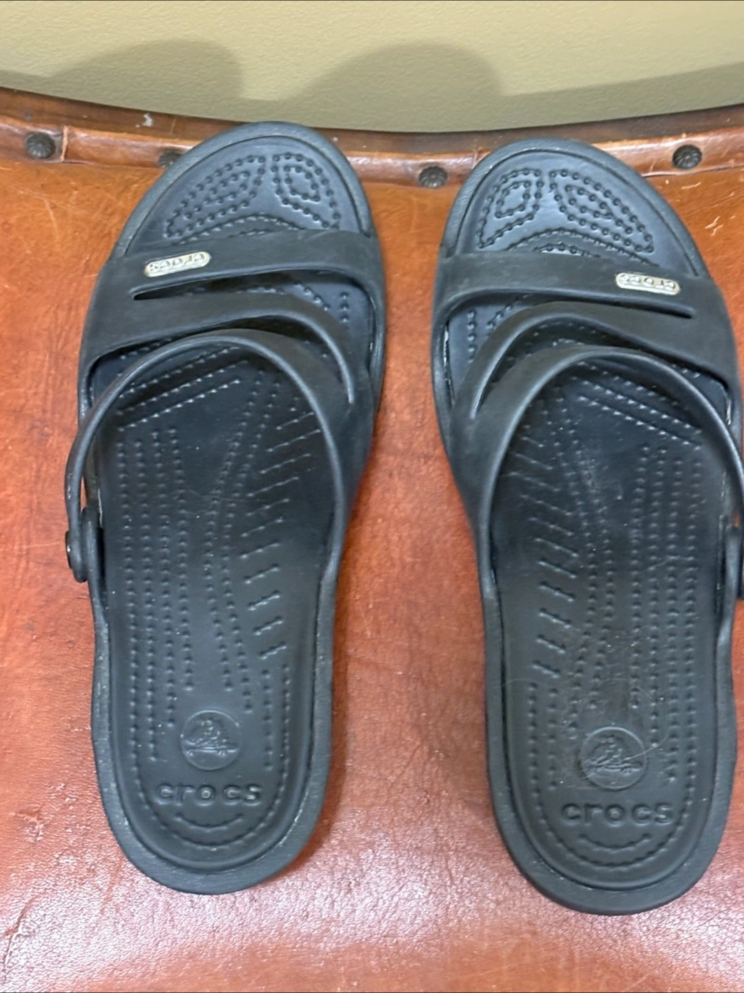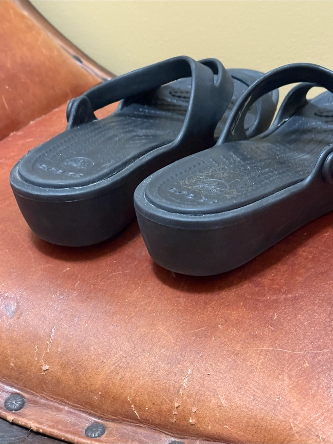 Black Crocs sandals - Patricia (discontinued style). Features include an elevated sole. Perfect for slipping on after a long day and relaxing your feet. Waterproof and sturdy!! You cannot find these in the stores anymore. I will be cross posting them to sell quickly. They are amazing sandals. Backstory: I bought them on EBAY (from the states) but they were too small for me. So I found more and re-ordered in a larger size. No holds Cash only