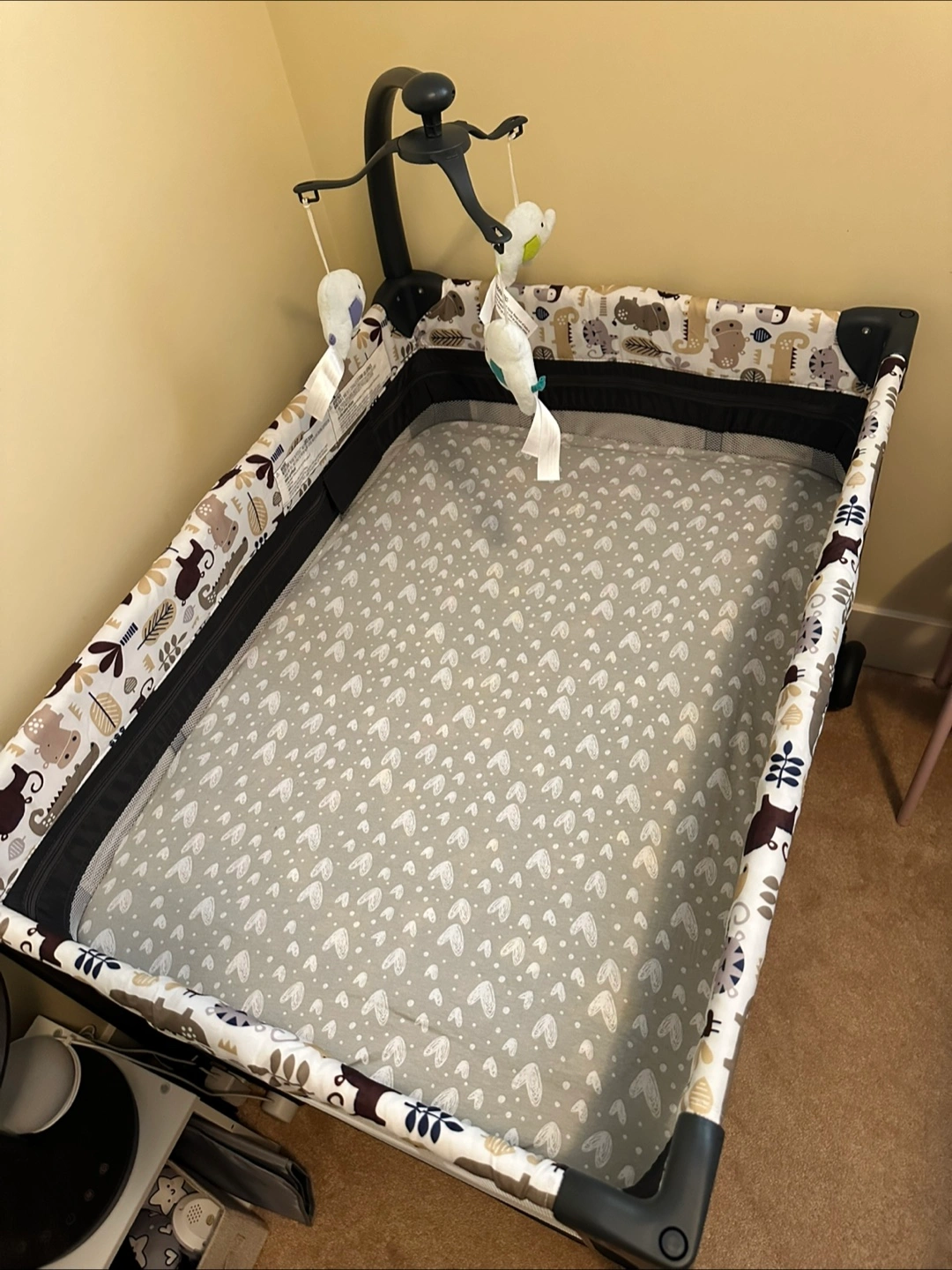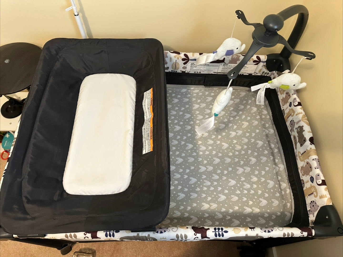Playard features a changing table. Also features a mobile. The playard has a cute patterned design. A lovely item for bringing a sense of peace to your little one's space.
