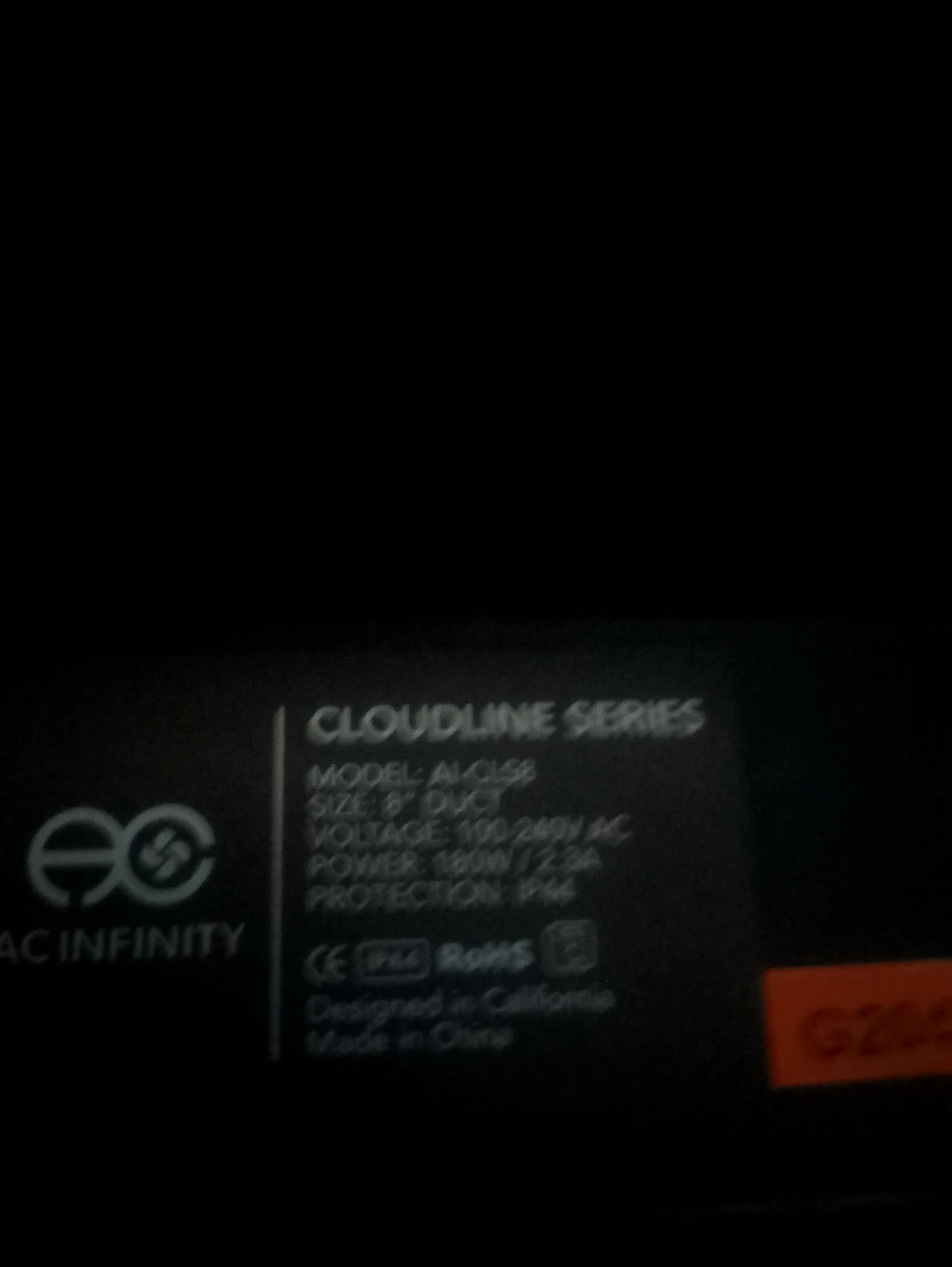 AC Infinity Cloudline Series inline duct fan. Model AL-CISB. 8" duct size. 100-240V AC voltage. 180W power, 2.2A. IP44 protection rating. Designed in California, made in China.