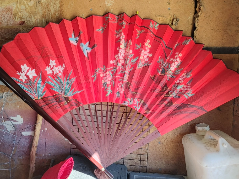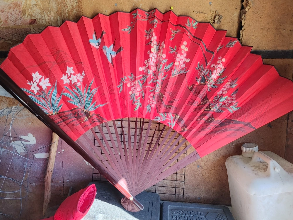 102 beautiful red hand fan. Features floral and bird details. Wooden handle. home deco