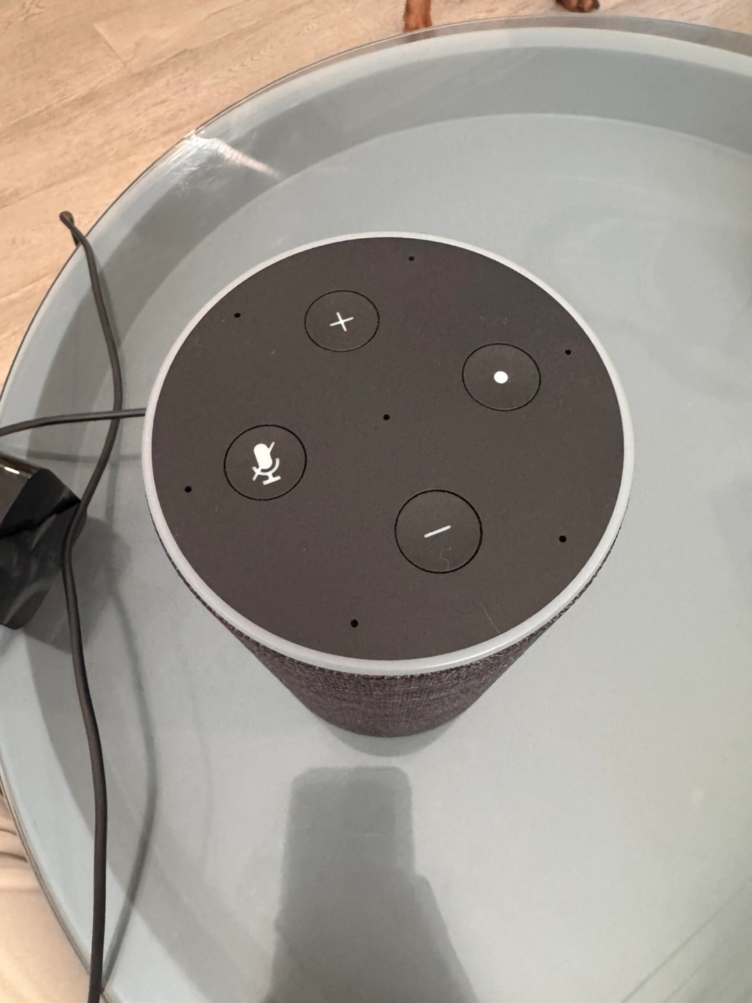 It is a cylindrical speaker with a fabric finish. Buttons on the top for volume and microphone control. Includes a power adapter.