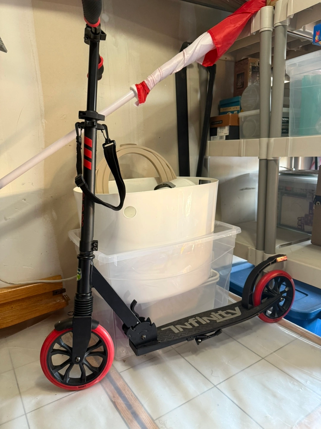 Black scooter with red wheels, handlebars, and a rear light. Handlebars include red grips and a carrying strap. Kickboard has a textured surface and large 'INFINITY' branding. Handles bars , handles fold down , also has strap for carrying . Scooting is an awesome way to enjoy a bit of fresh air and sunshine.
