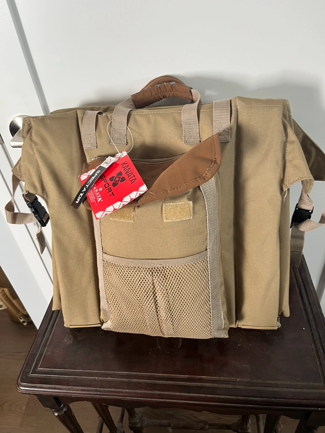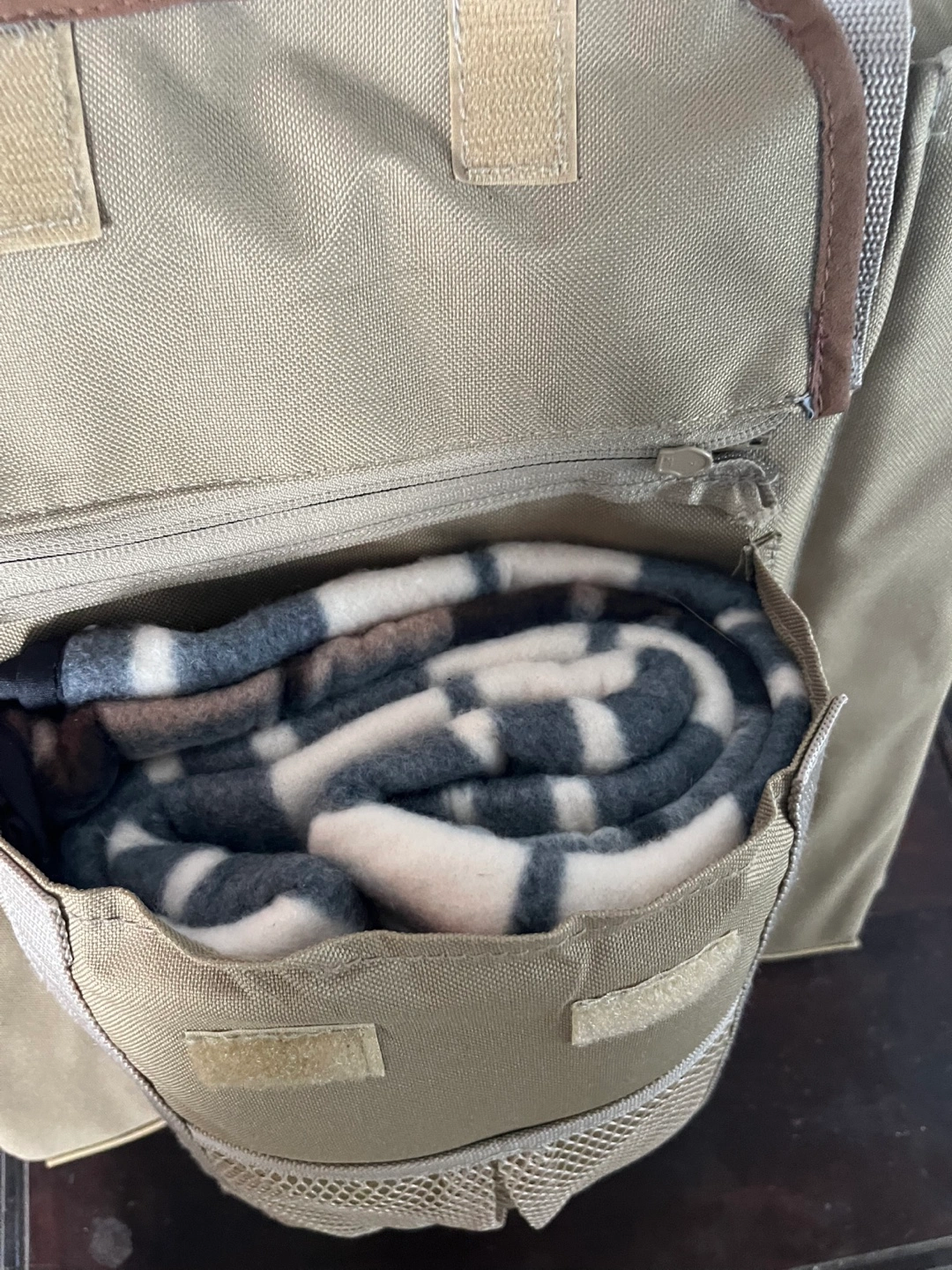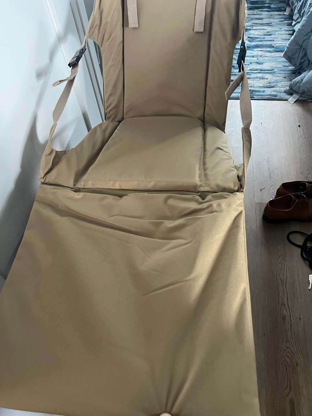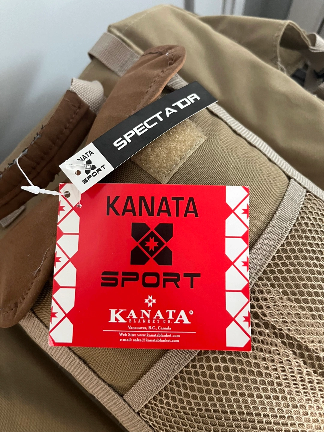 A portable spectator chair in a neutral colour. Made with a cushioned seat and back. Straps and buckles for carrying or securing. It also has a pocket with a blanket for added warmth and comfort, perfect for any outdoor event.