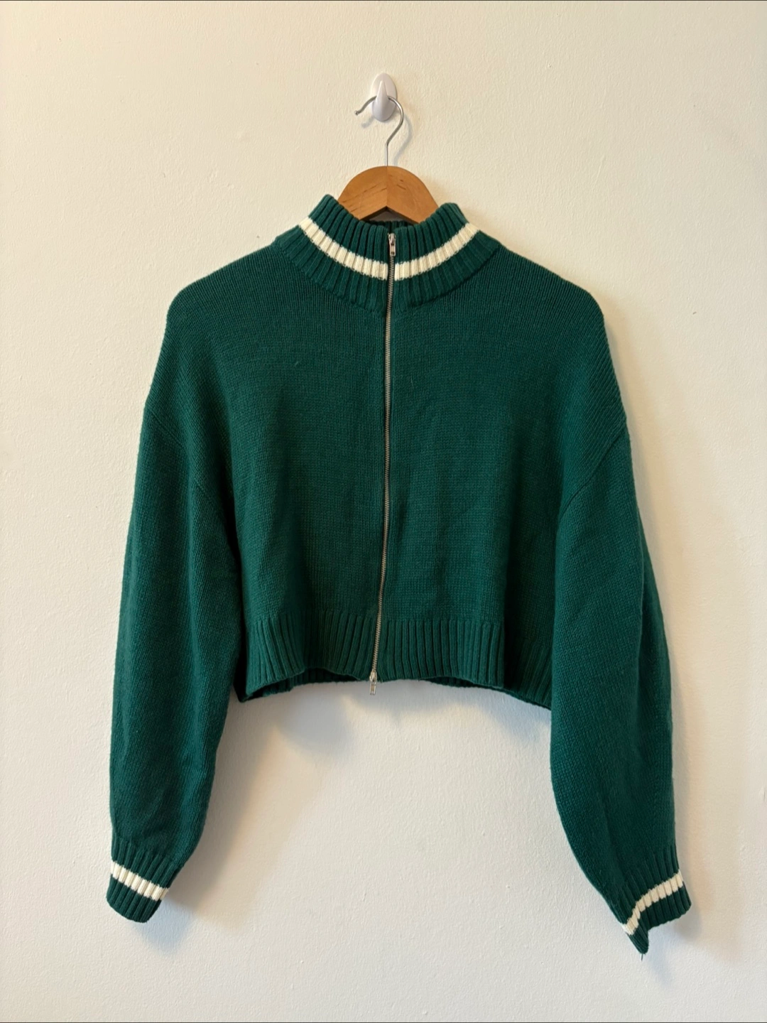 A pretty green sweater. A cropped length, with a zip-up front. White stripes on the collar and sleeves.