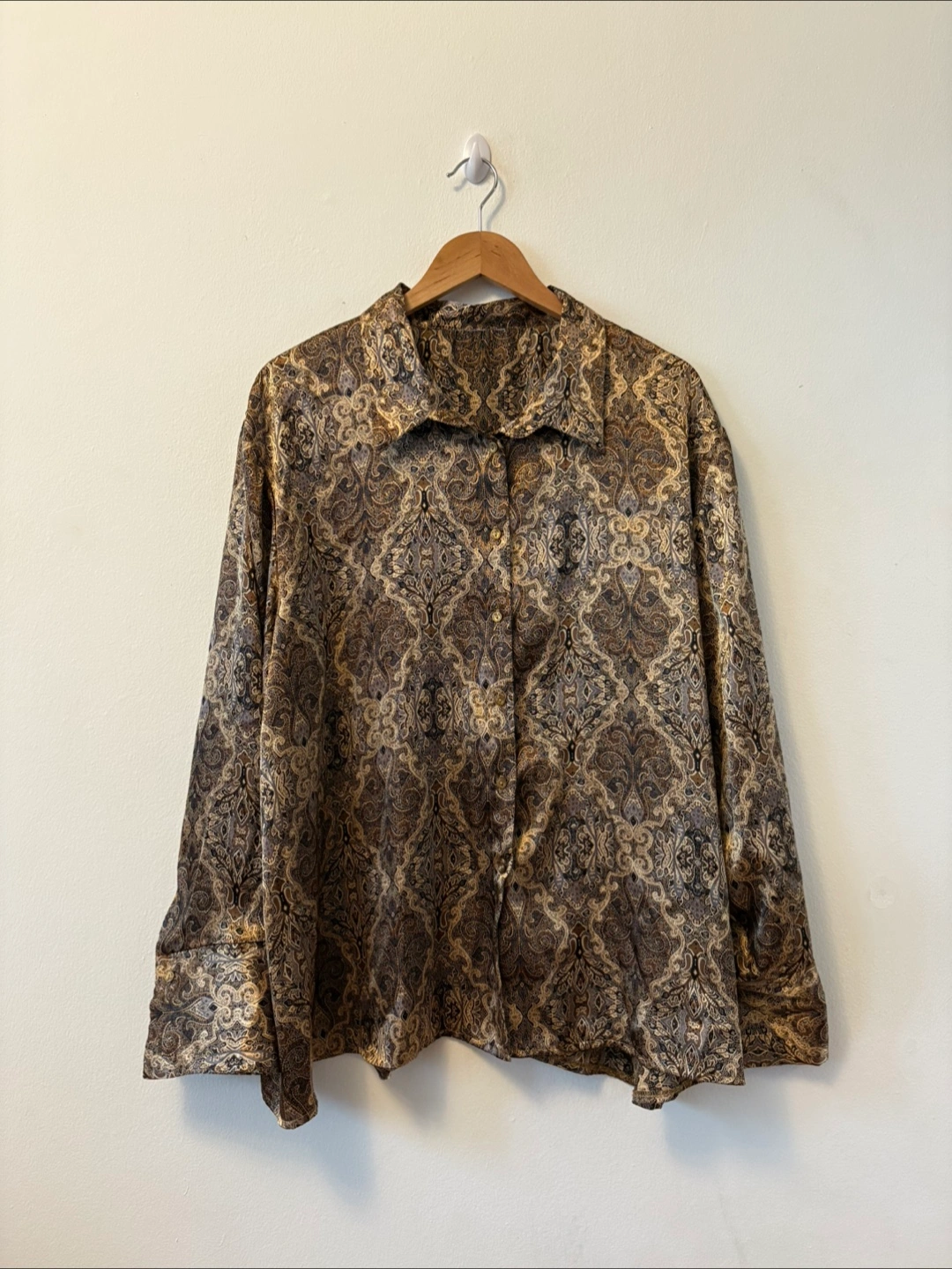 Button-up silk shirt. Long sleeves with buttoned cuffs. Features an all-over pattern.