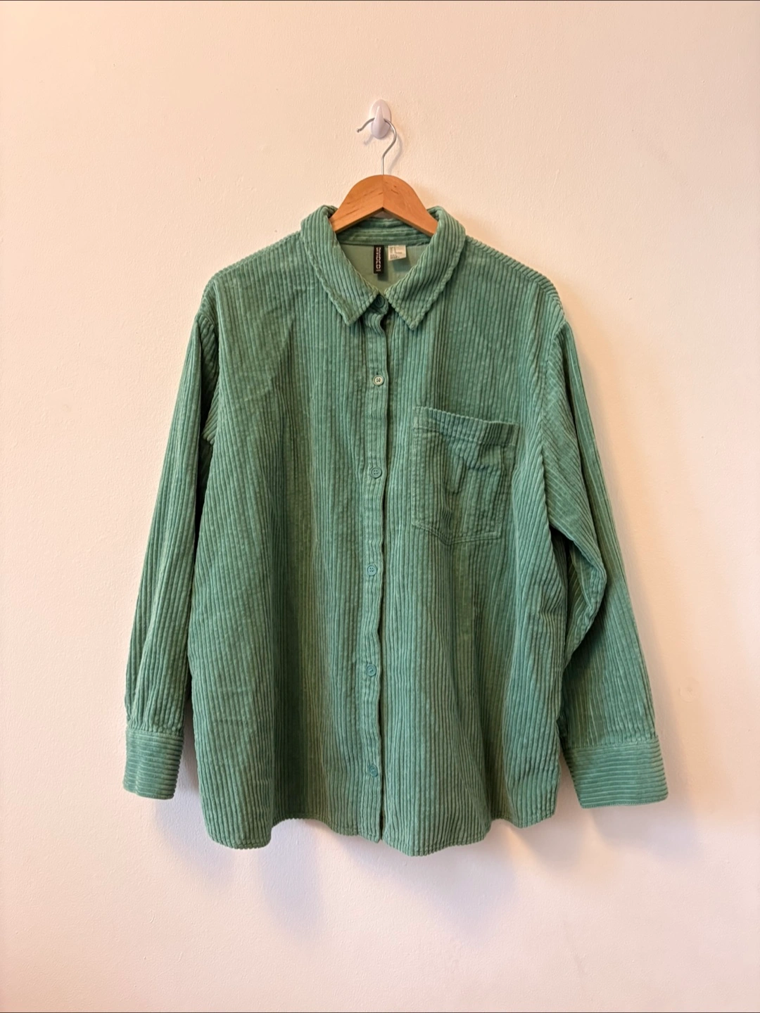 A comfortable corduroy shirt in a nice sage green color. Features long sleeves with button cuffs. A pocket on the chest.