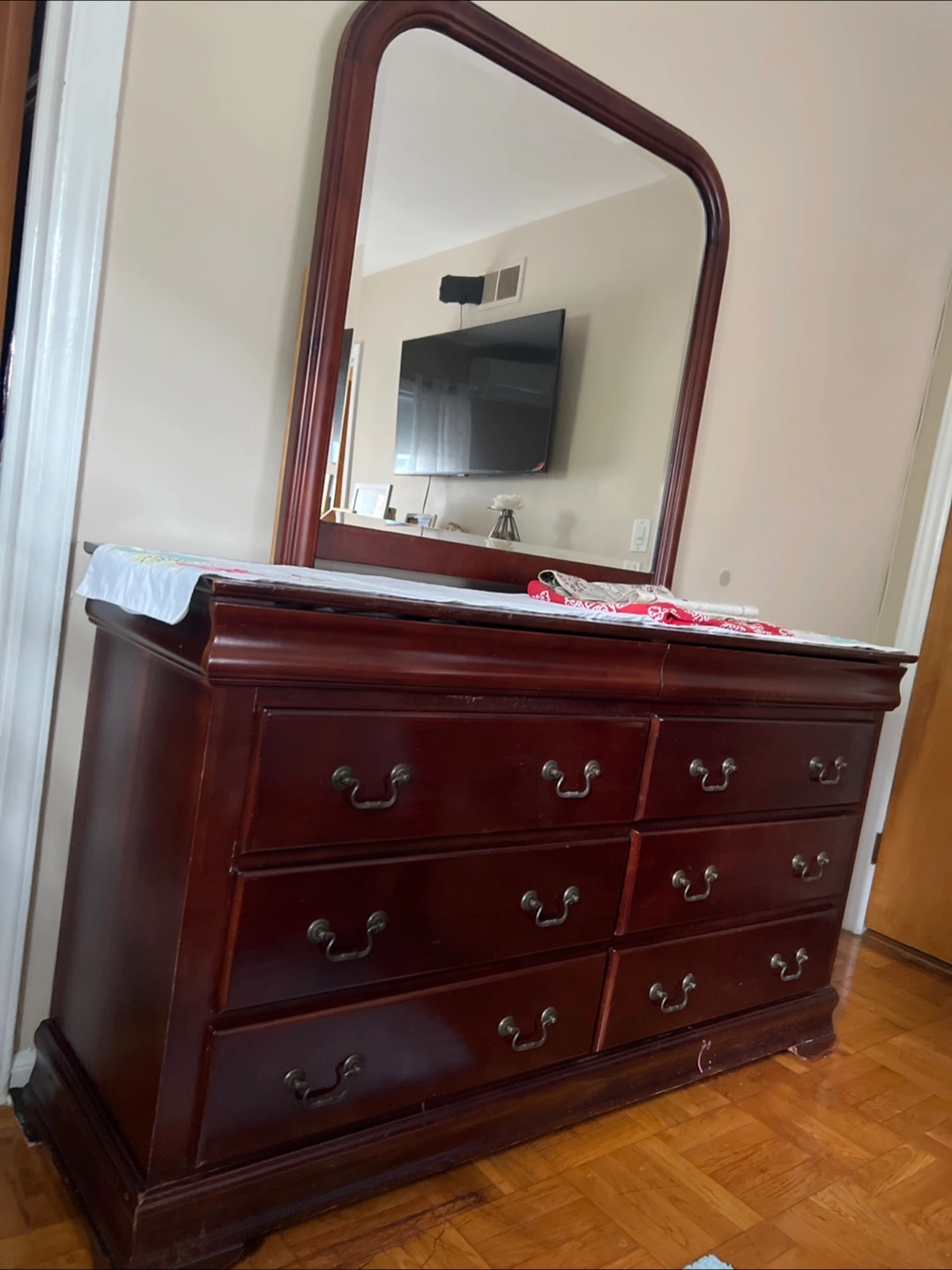 The dresser features a rectangular shape. It has multiple drawers. It includes a mirror. A lovely item to organize your belongings and have a space to relax.