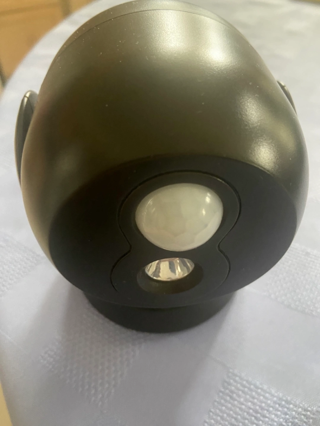 A black, egg-shaped object. It has a rounded top, with a round, black casing on the bottom. It includes a light and a sensor. You can use this in your home for security, creating a safe and serene feeling. Size D battery operated. Cash and carry only.
