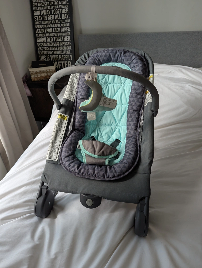 Cute bouncer with a blue and grey colour scheme. Includes a removable toy bar. The bouncer has a patterned design on the seat back. This bouncer is perfect for soothing your little one. Battery operated gentle vibration and two adjustable height levels.