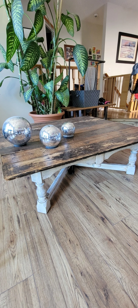 Solid wood coffee table. The top appears to be made from reclaimed wood planks. It features a white painted base. This is heavy, large and beautiful. A few dings, not really noticeable.