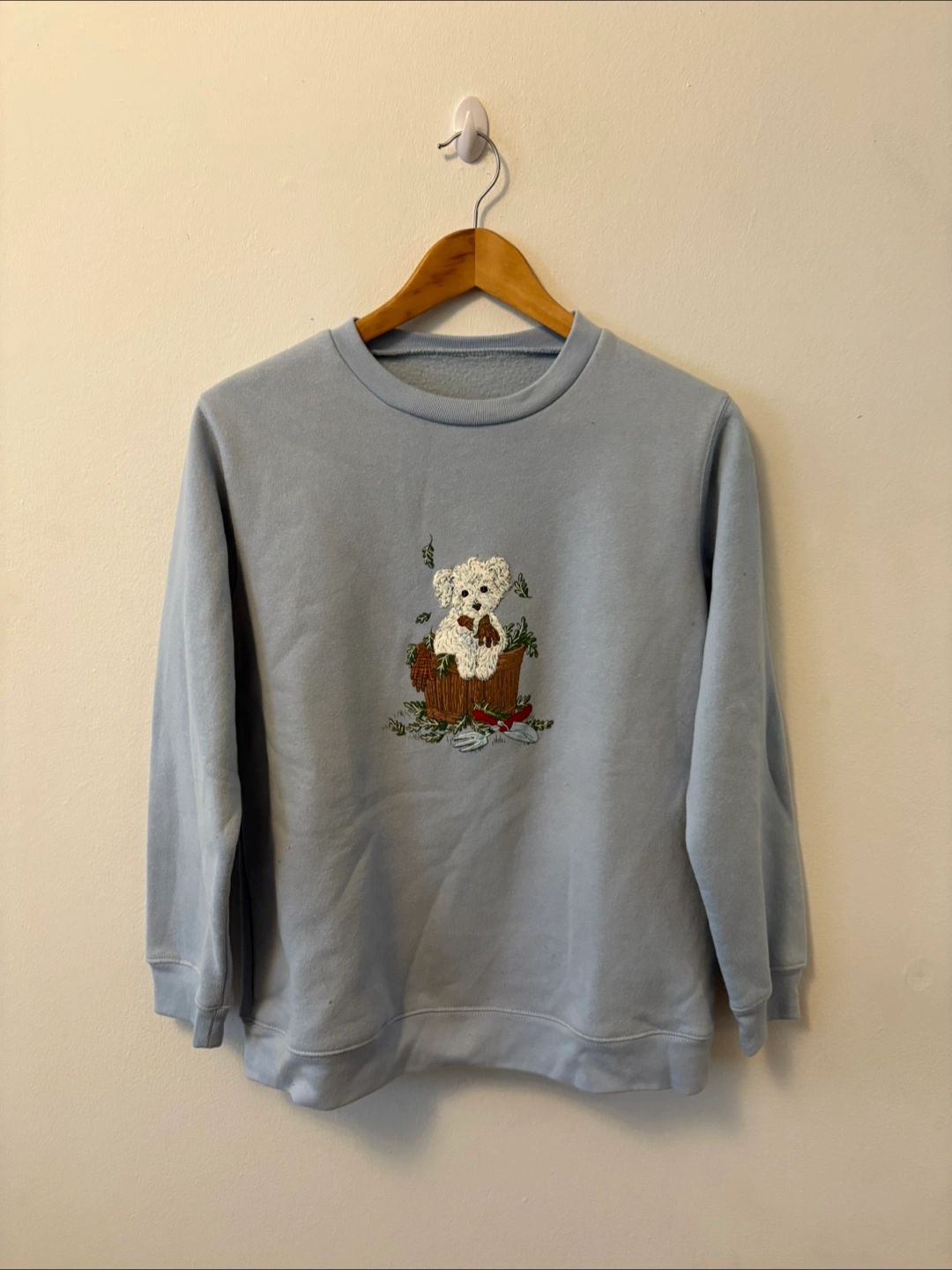 Cute light blue crewneck sweater with dog embroidery, very soft and in great shape