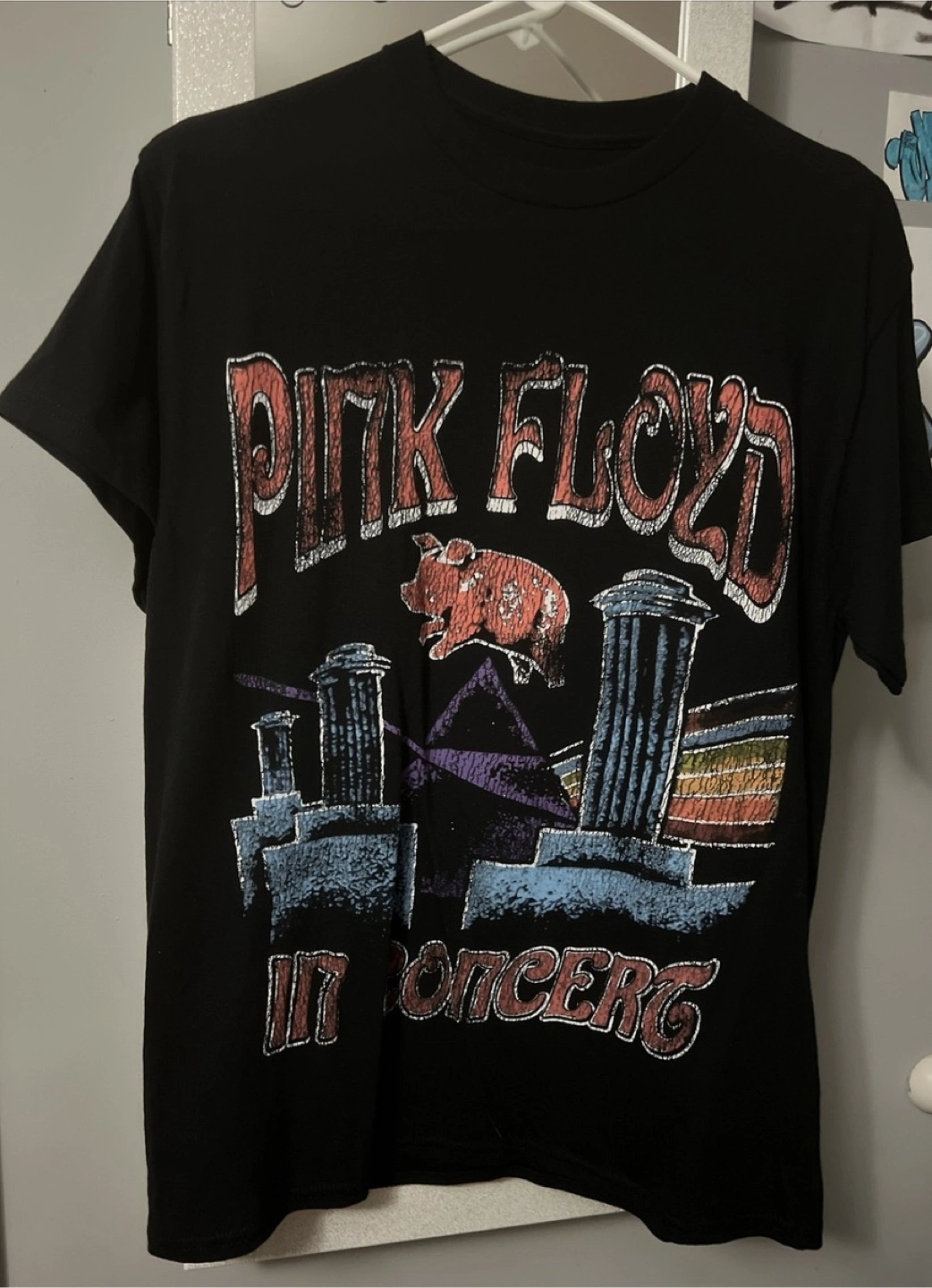 Selling a black Pink Floyd "In Concert" t-shirt! The graphic features the band's name, a pig, and some cool architectural elements. Great for any Pink Floyd fan!