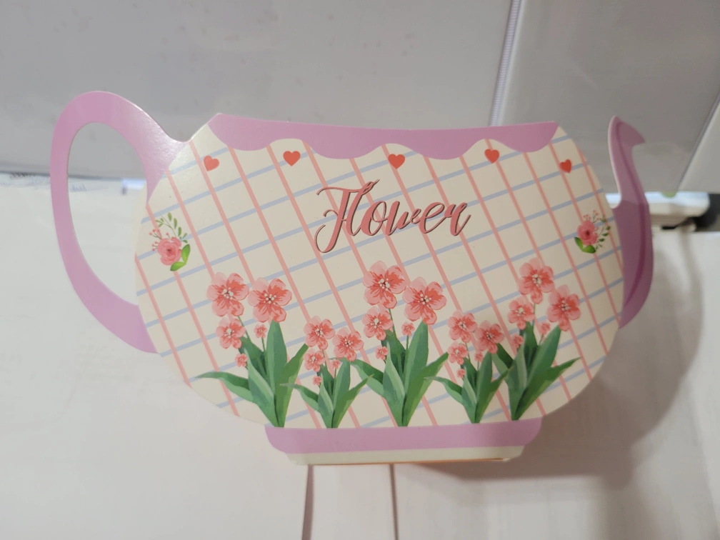 This is a cute flower teapot-shaped gift box! It's perfect for small gifts or treats. Great for putting a small plant in to give as a gift.