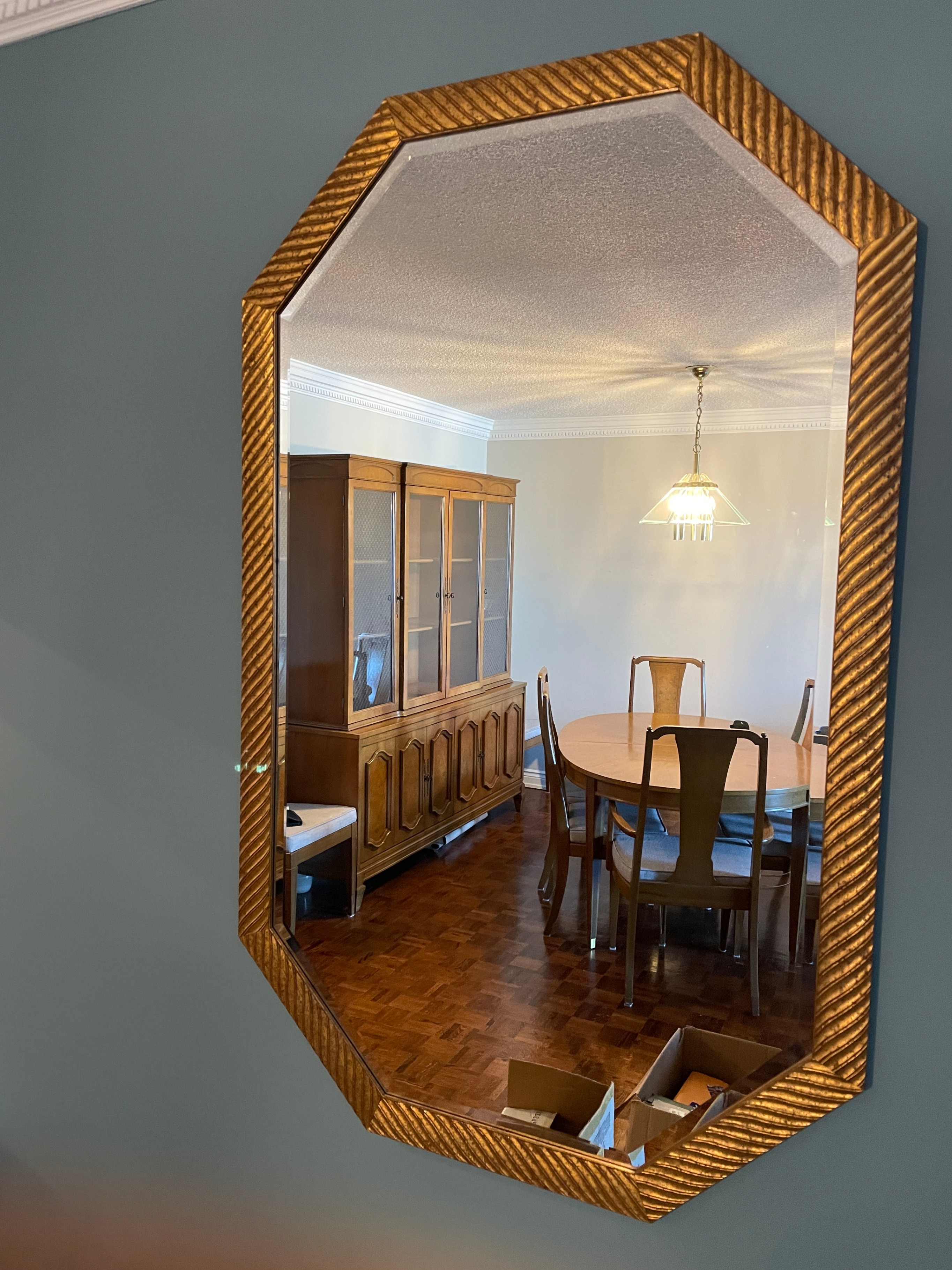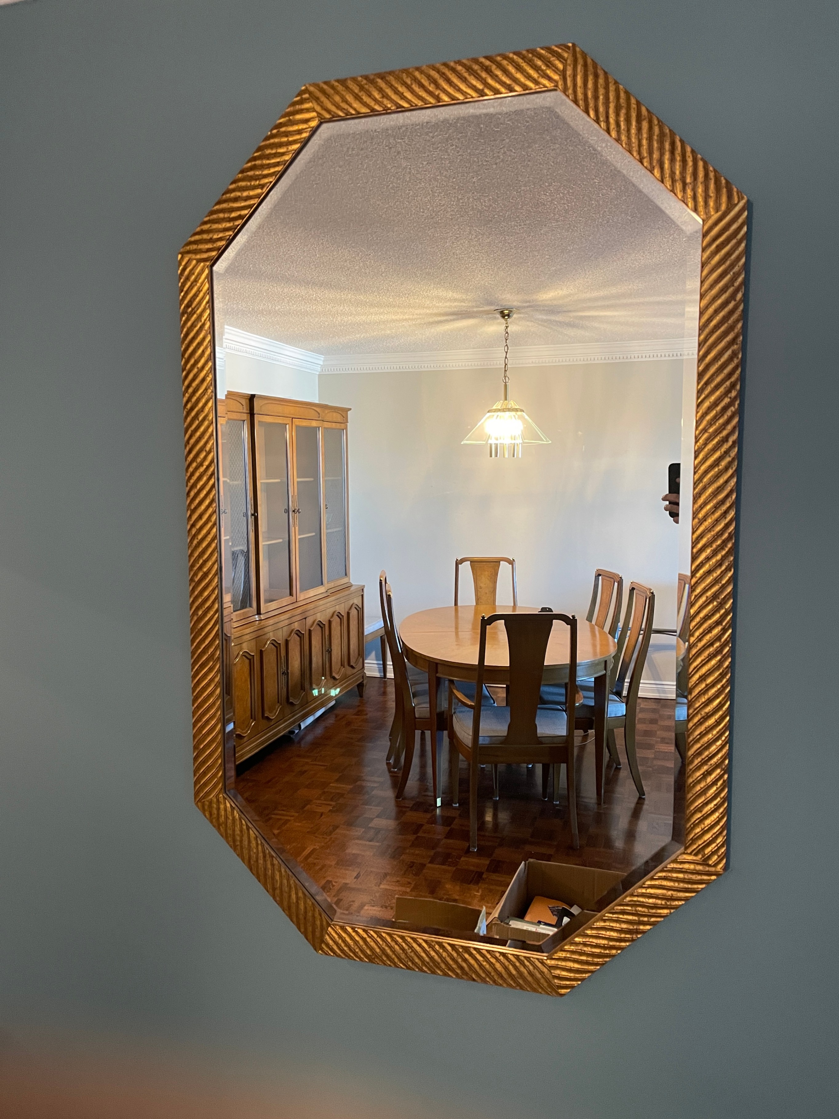 Beautiful gilded wall mirror with an elegant octagonal frame. Classic, timeless design that adds light and depth to any room.