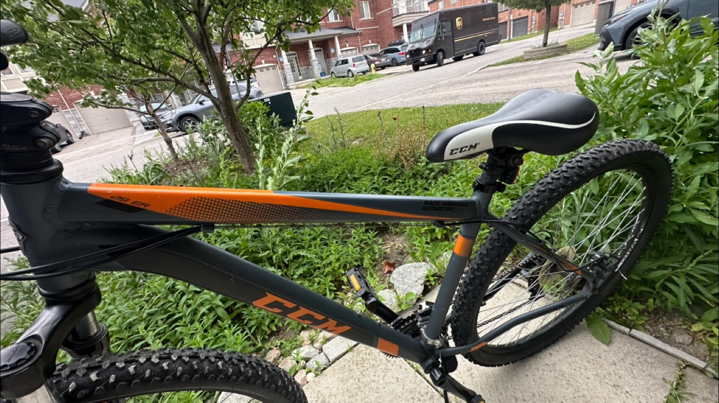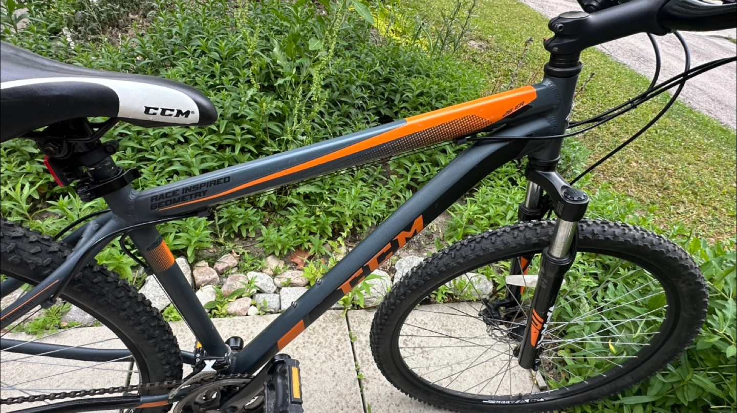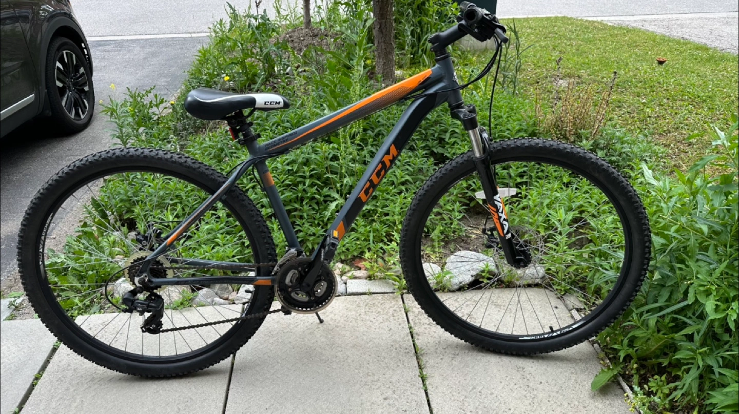 Selling a CCM 29 ER mountain bike in grey and orange. Frame size 7.1in. It's in good condition and ready for some trails or just cruising around the neighbourhood! It features race-inspired geometry for a comfortable ride.