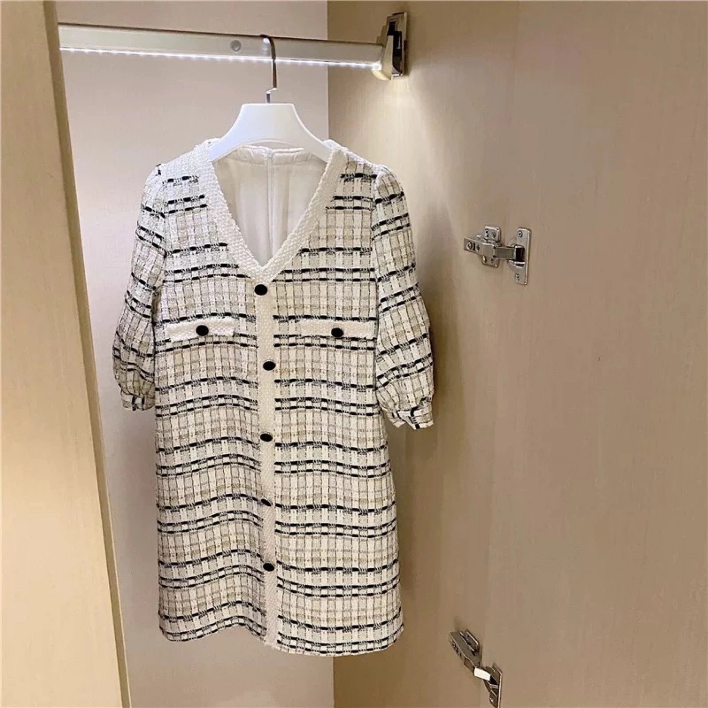 71Selling a stylish tweed dress in a classic black and white pattern. It features a V-neck and button-down front. Perfect for a chic and timeless look!