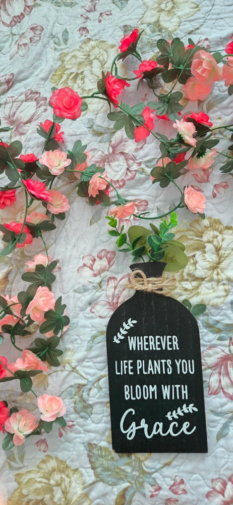 wooden board sign that says 'Wherever life plants you bloom with grace'.