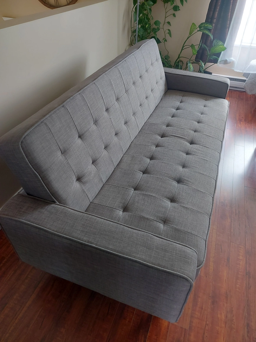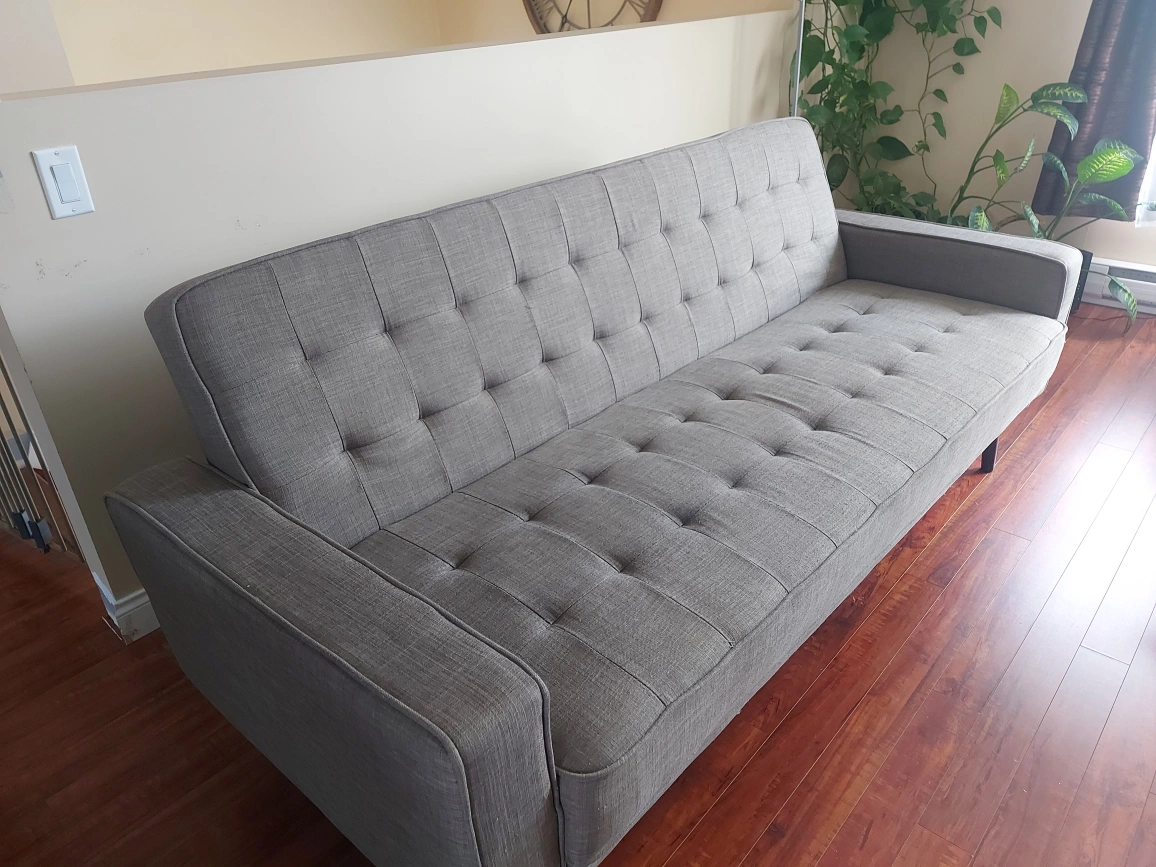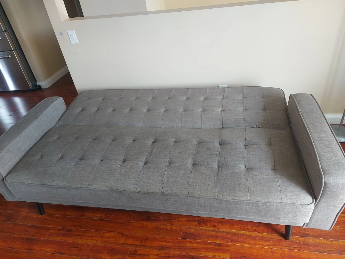 Selling a grey futon sofa bed. It's in great condition and would be perfect for a living room or spare room. It easily converts from a sofa to a bed, making it versatile for guests or small spaces