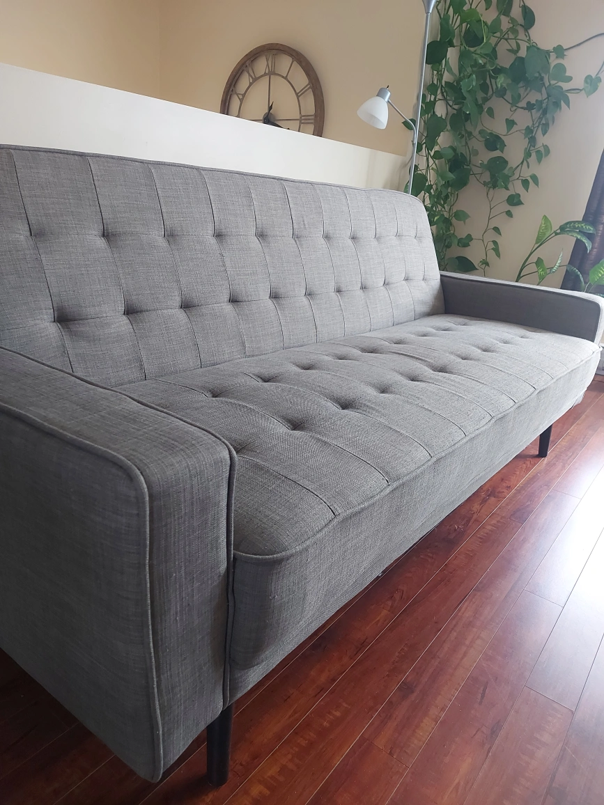 Selling a grey futon sofa bed. It's in great condition and would be perfect for a living room or spare room. It easily converts from a sofa to a bed, making it versatile for guests or small spaces