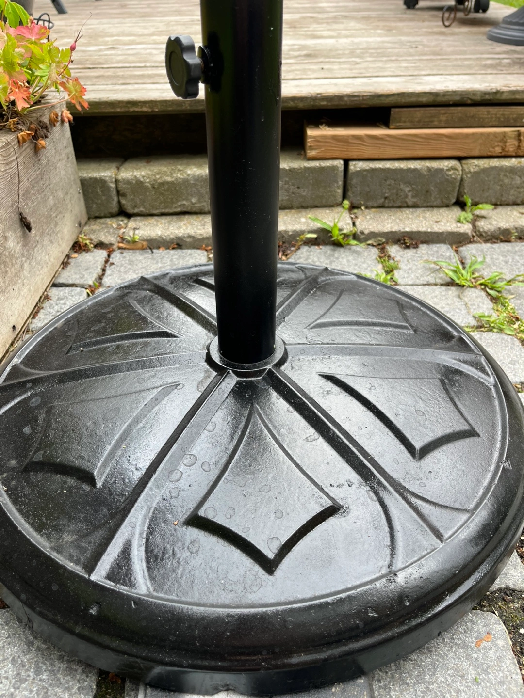 Selling a sturdy black umbrella base! It's in great shape and ready to keep your umbrella secure. It measures approximately 19 inches in diameter.