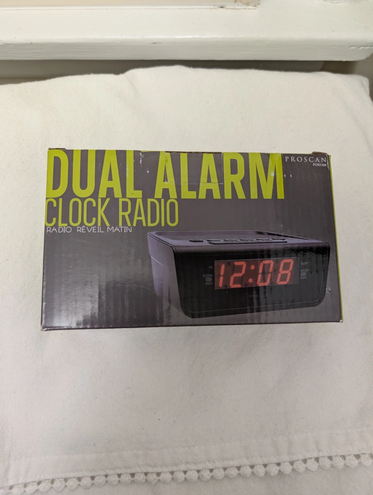 Selling a Proscan dual alarm clock radio. It features AM/FM digital tuning radio, preset stations, and an LED display. It also has a snooze and sleep function, and you can wake to a buzzer or the radio.