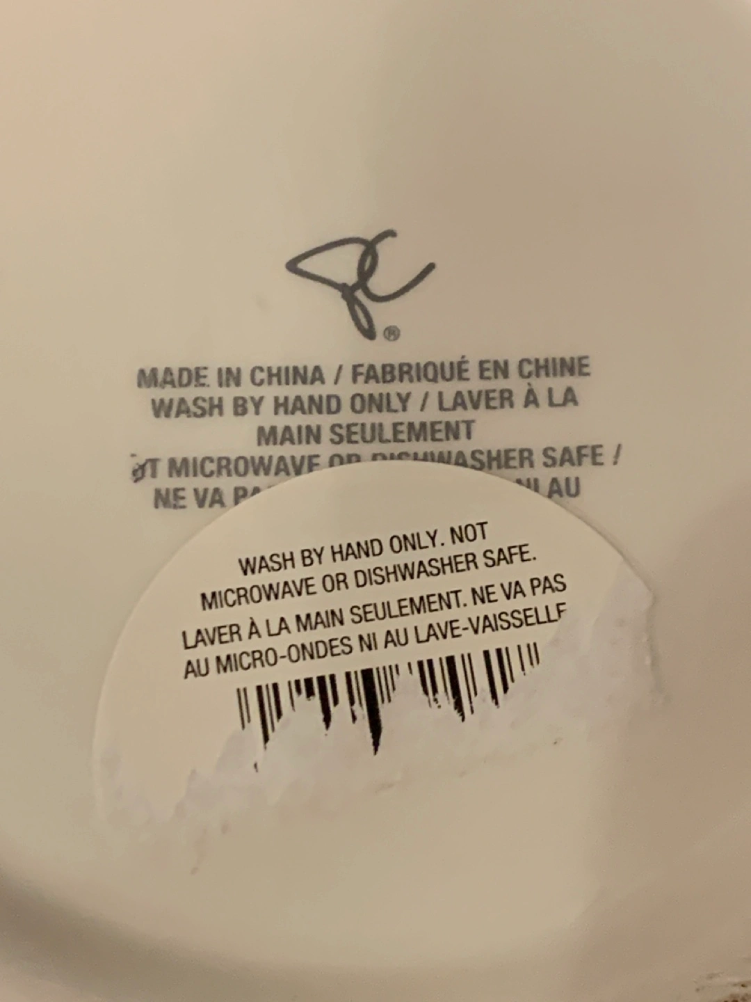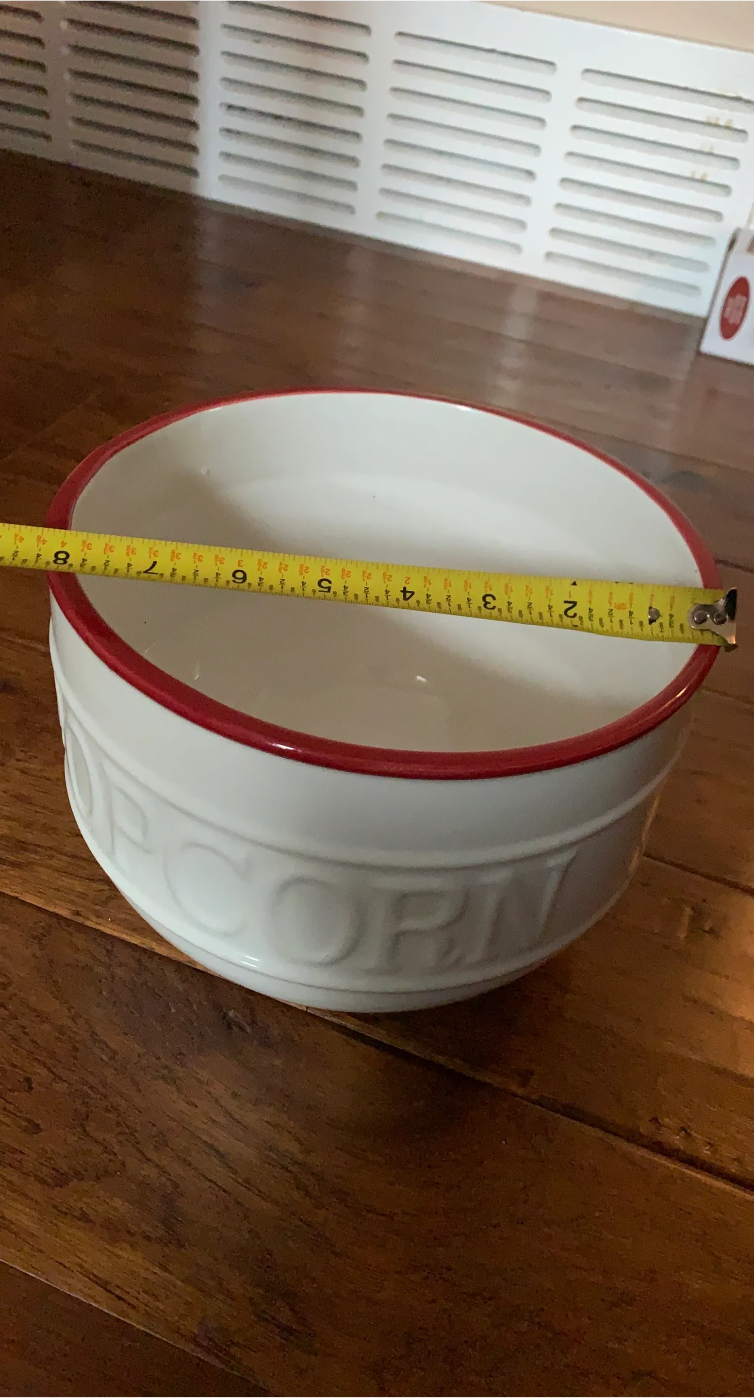 Selling a PC brand popcorn bowl. It's ceramic white with a red rim and has "POPCORN" embossed on the side. It is recommended to wash by hand only, not microwave or dishwasher safe.