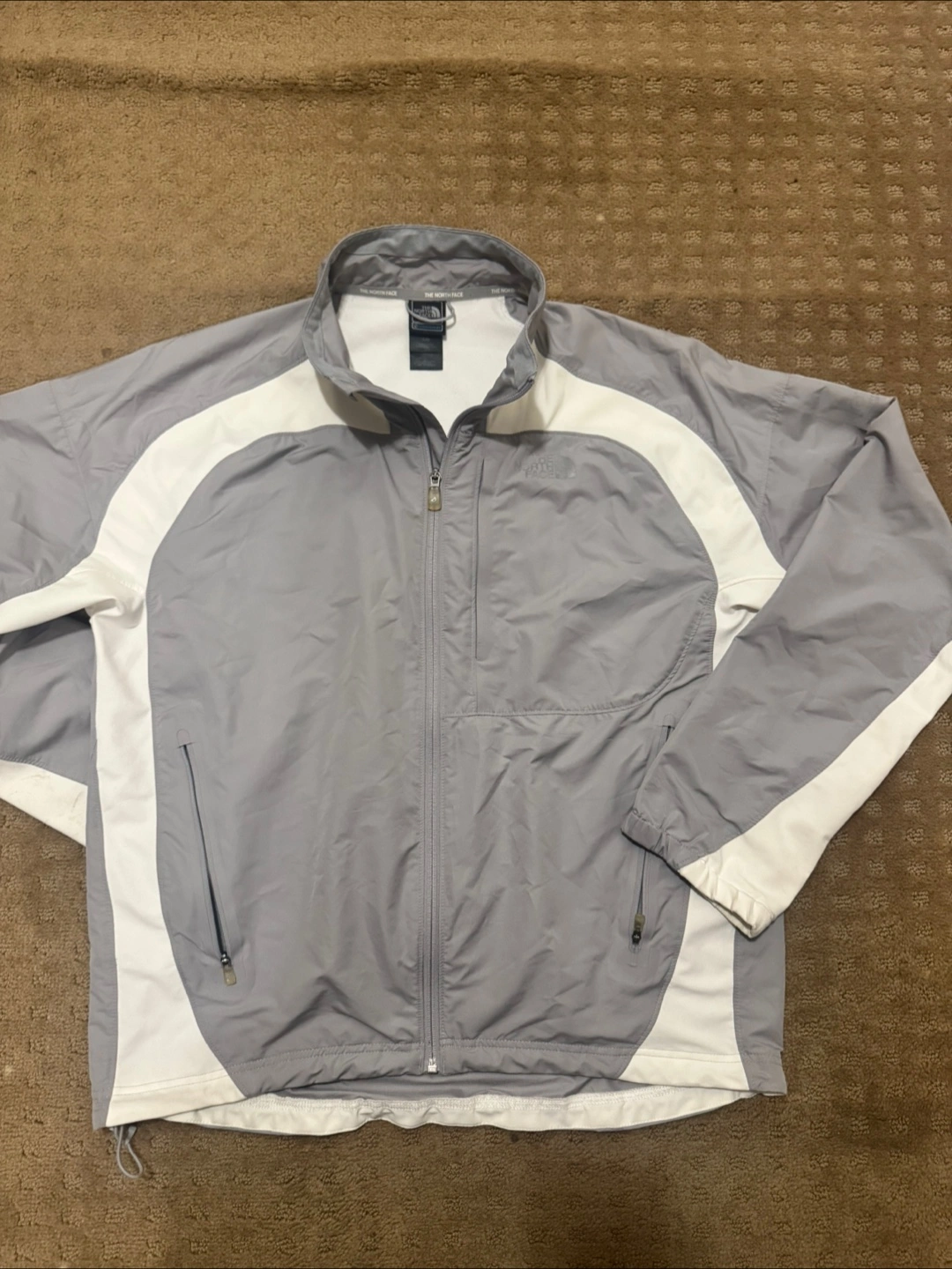 Selling a comfy jacket from The North Face. It's a lovely grey and white colour, and it's a size Large. Perfect for layering or wearing on its own!