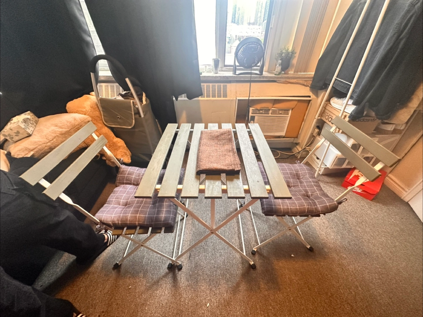 Selling an IKEA folding table and chairs set. It's perfect for small spaces and easy to store when not in use. The set includes a small table and two matching chairs with padded cushions.