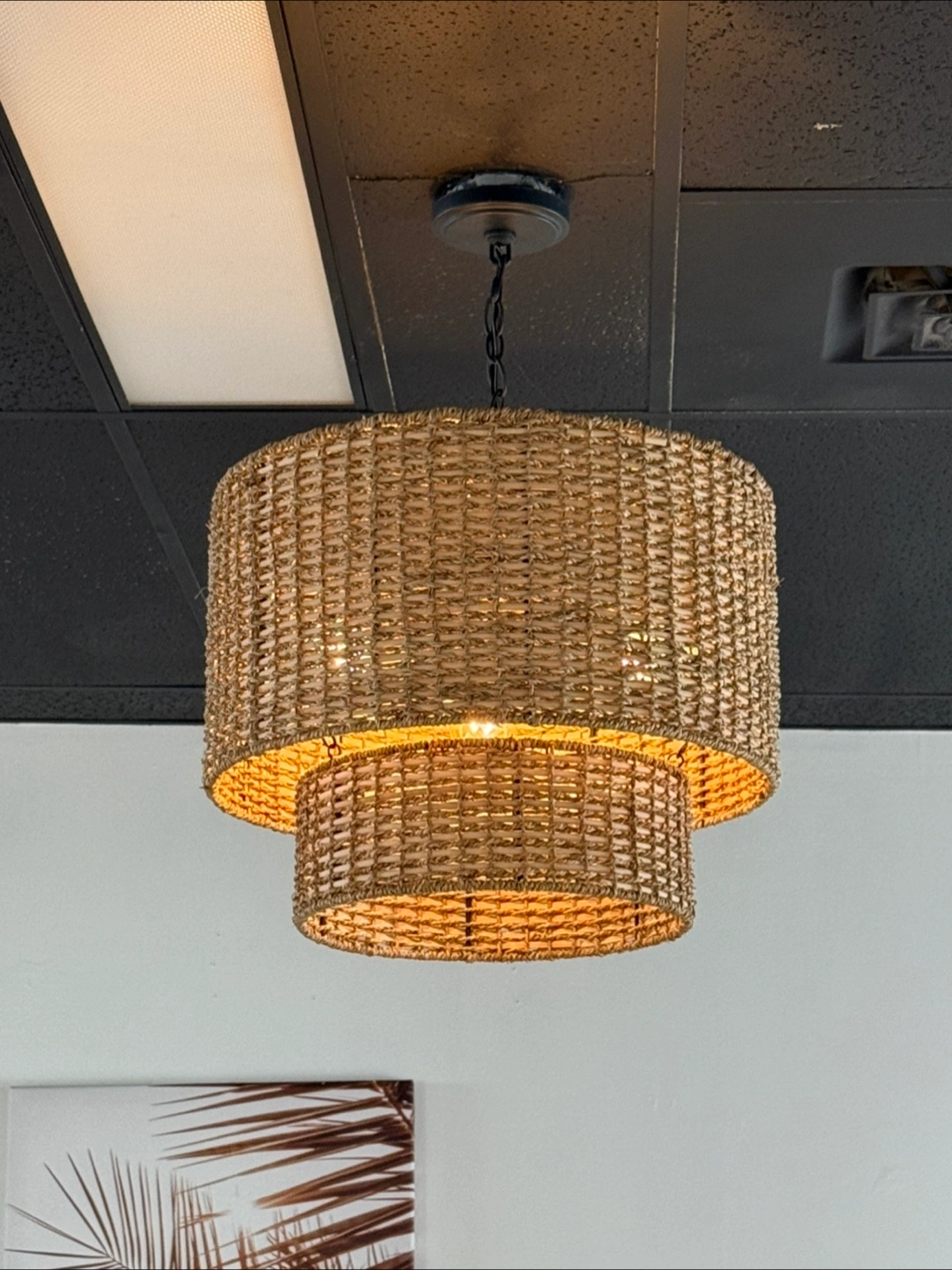 This is a beautiful woven rattan pendant light that would add a touch of natural warmth to any room. It's in great condition and ready to hang!