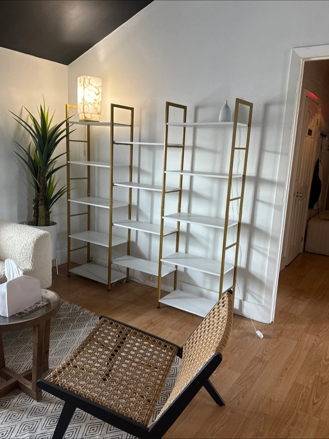 Selling a bookshelf with a gold frame and white shelves. It's in great condition and would be a stylish addition to any room