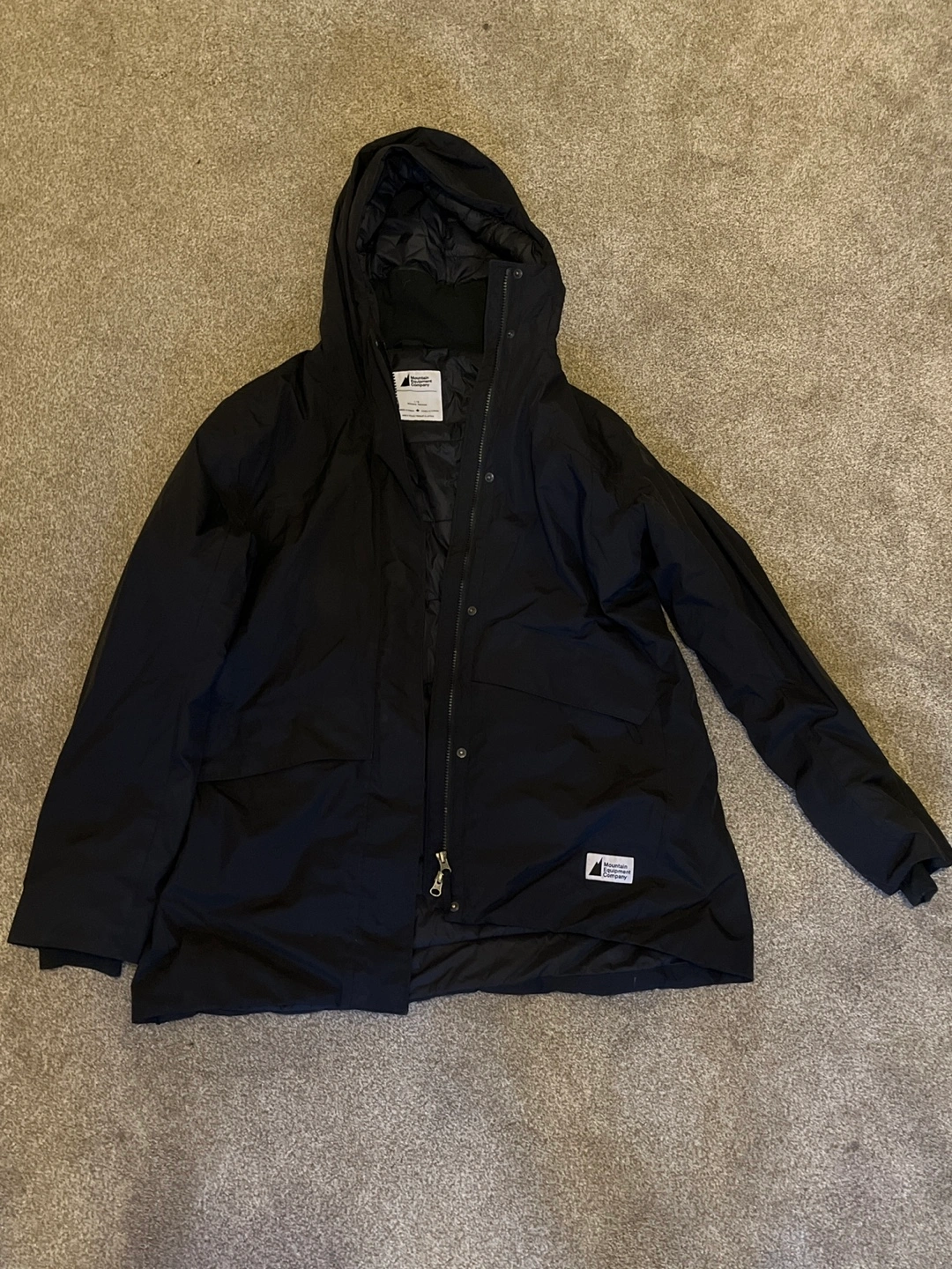 Selling a Mountain Equipment Company (MEC) women's coat in size large. It's a stylish and functional piece in classic black, perfect for staying warm and dry.