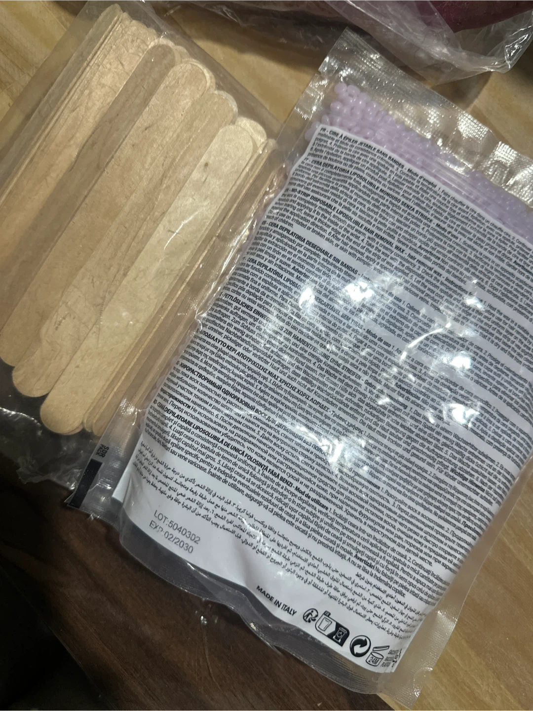 This is a 500g bag of It's Waxing Time! Curapro Mauve Jasmin hard wax beads, plus wooden applicator sticks. The wax is a "Mauve Jasmin" variety for extra crystal results. It's made in Italy. EXP: 02/2030.