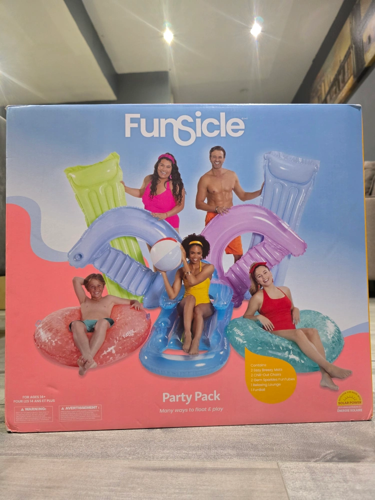 Selling a brand new FunSicle Ensemble Party Pack! It includes a variety of fun inflatables for the pool or lake. Perfect for summer fun with friends and family! The box contains: 2 loungers, 2 wavy breezy mats, 2 gem sparkles funtubes, 1 swimming lounge, and 1 funsill