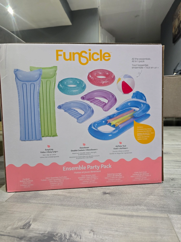 Selling a brand new FunSicle Ensemble Party Pack! It includes a variety of fun inflatables for the pool or lake. Perfect for summer fun with friends and family! The box contains: 2 loungers, 2 wavy breezy mats, 2 gem sparkles funtubes, 1 swimming lounge, and 1 funsill