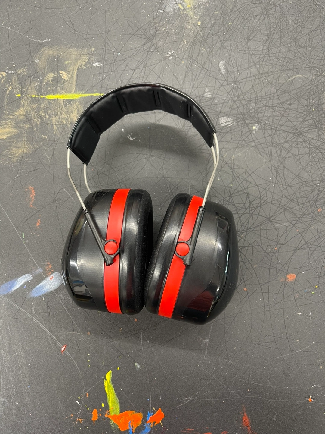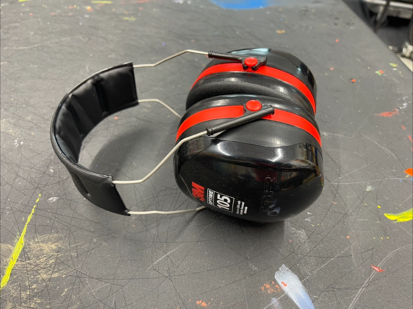 Selling a pair of 3M Optime 105 earmuffs in black and red. These earmuffs are designed to provide excellent hearing protection. They are in good condition and ready for use!