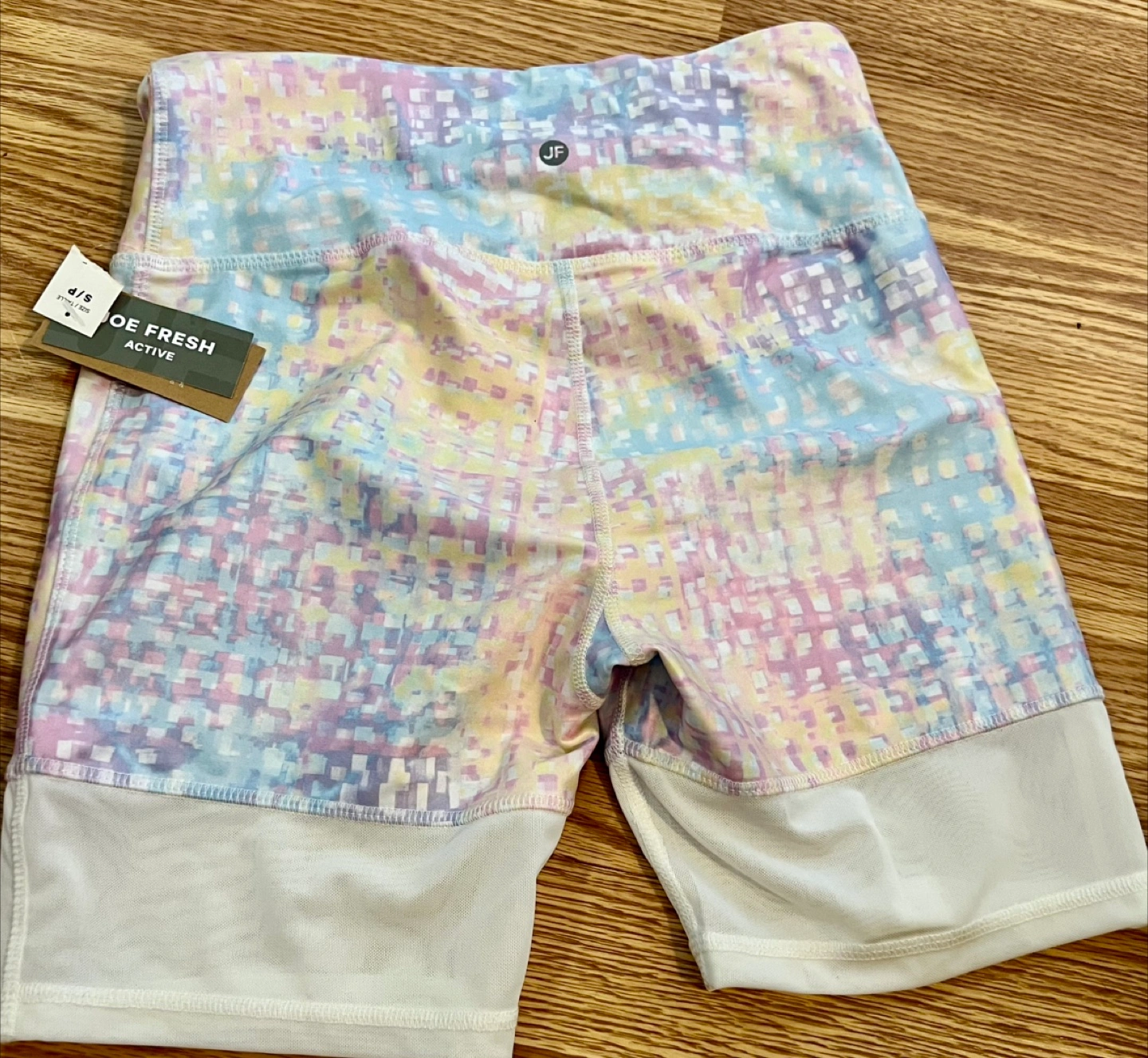 Cute Joe Fresh active shorts with a colourful pattern and white mesh detail at the bottom! Size small and BNWT