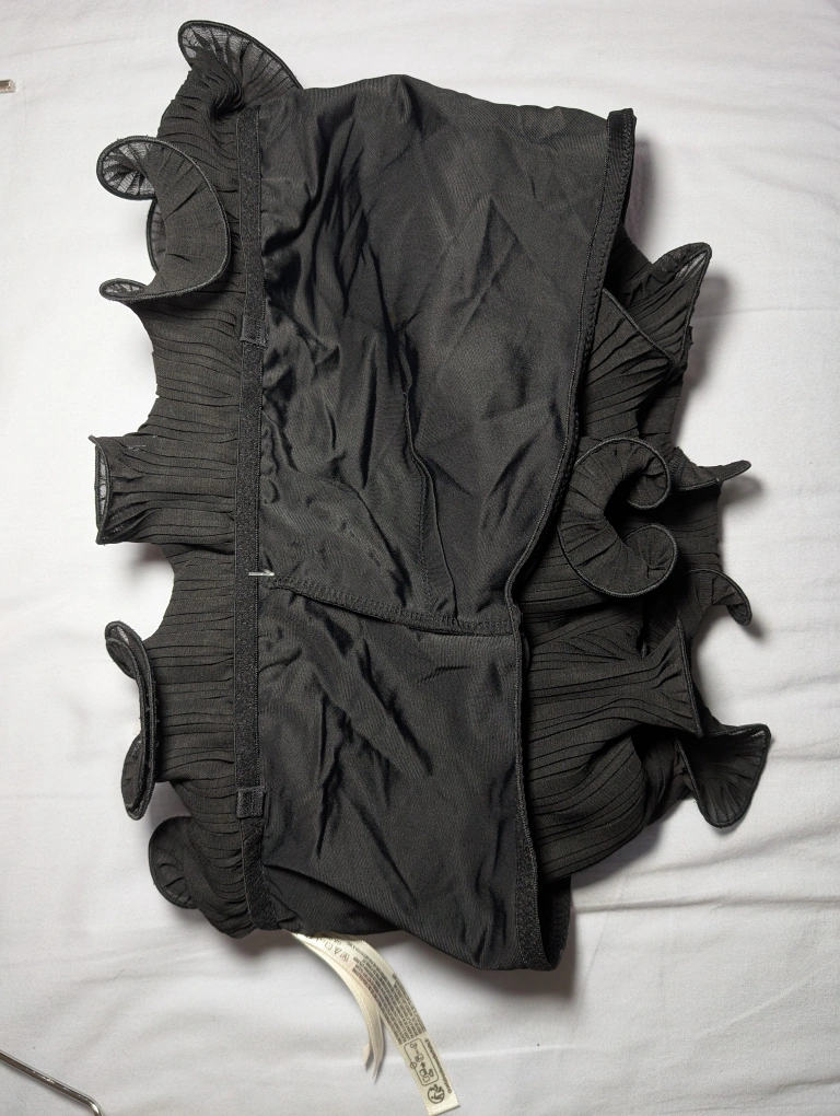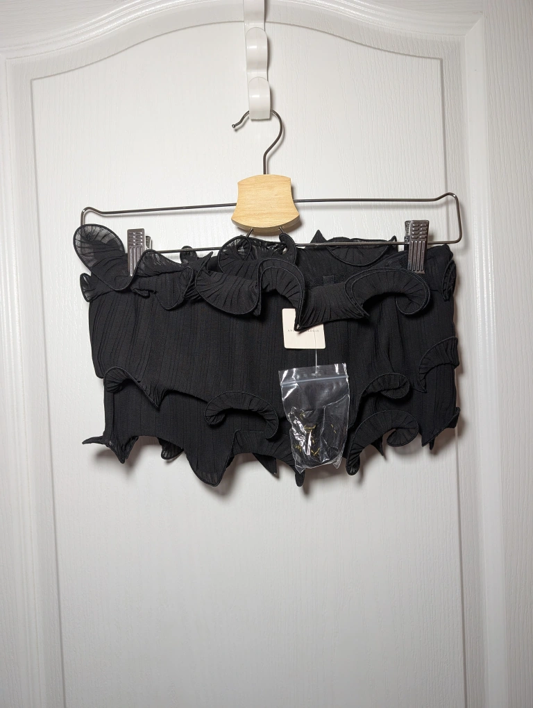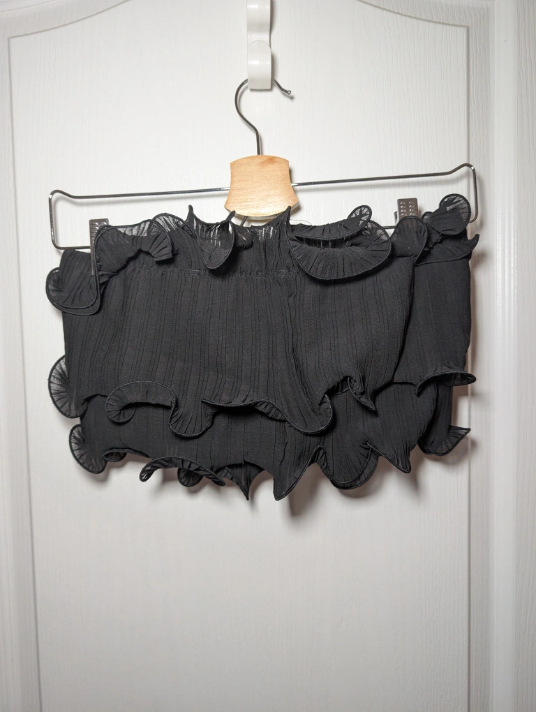 This is a lovely black ruffled skirt from Anthropologie in size M. The skirt has a unique design with layered ruffles and is in great condition. Originally bought for $68 CAD