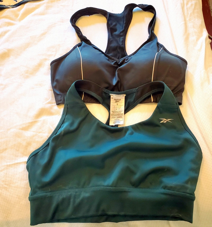 243Two Sports Bras in size large. One black; one dark green. Only lightly worn + in very good condition. $10 each.
