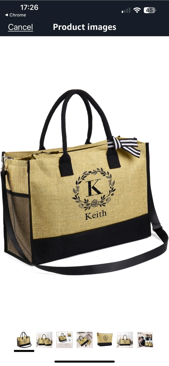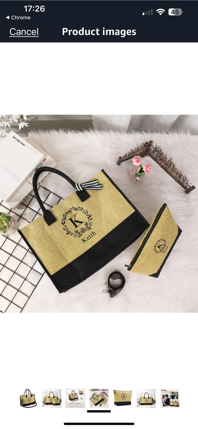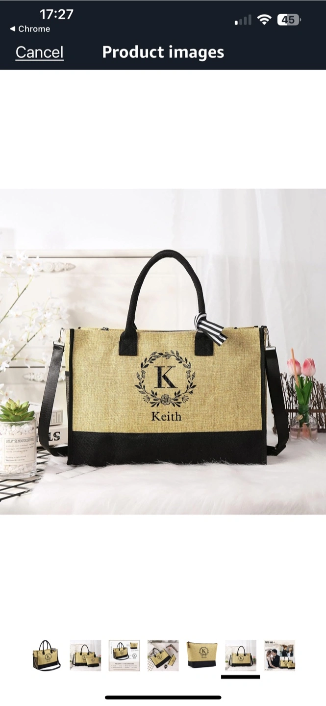 Jute initial beach bag with removable adjustable long strap and comfortable handle for crossbody, shoulder, hand and arm carry, easy to match with different clothes.