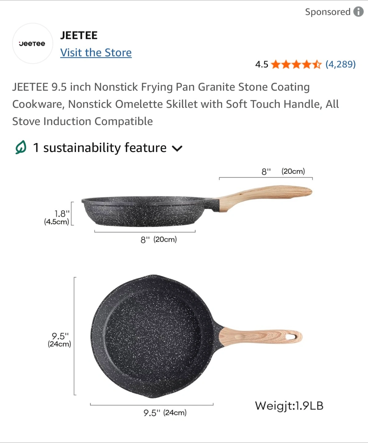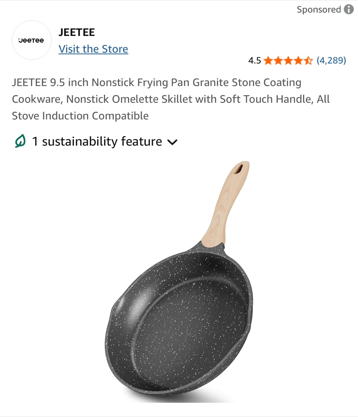 I'm selling a JEETEE 9.5 inch Nonstick Frying Pan with a granite stone coating! It has a soft touch handle and is compatible with all stove inductions. It's also easy to clean!