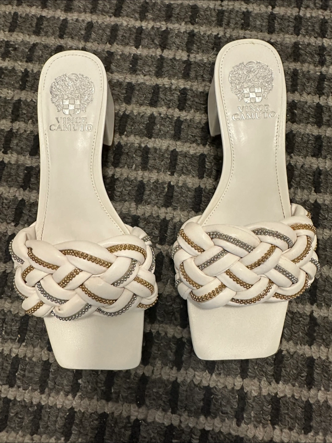 *New* Vince Camuto Block Heel sandals. These are a stylish white colour with a unique braided design (gold and silver accents in braid). They're a size 8M (Medium).