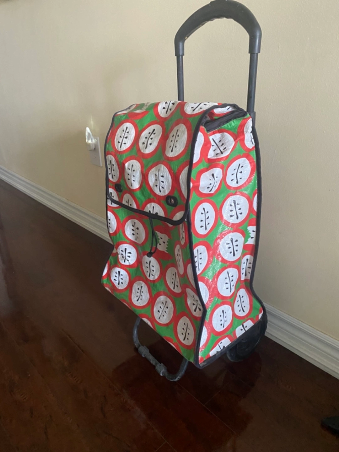 This rolling shopping cart is perfect for trips to the farmers market or grocery store! It features a fun green, red, and white pattern. The cart has a sturdy frame with wheels and a comfortable handle for easy maneuvering. It's in great condition and ready to help you carry your groceries with ease