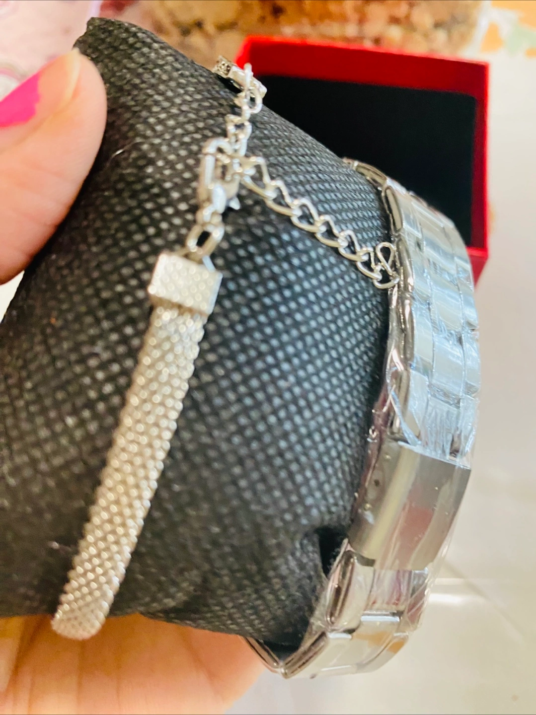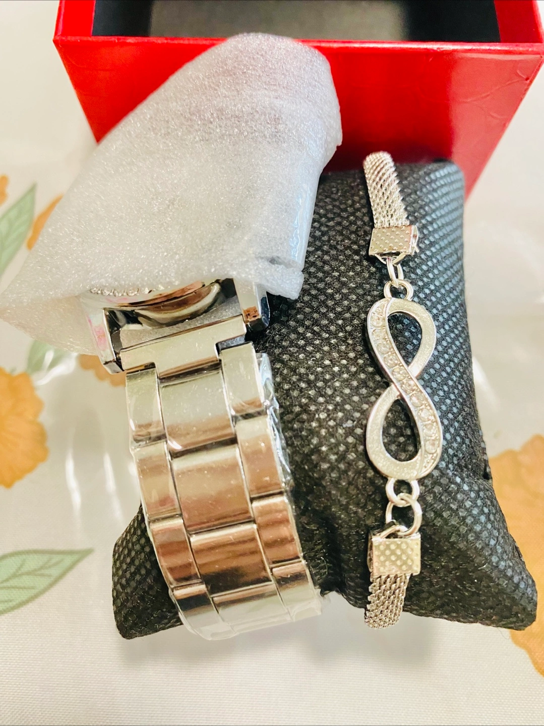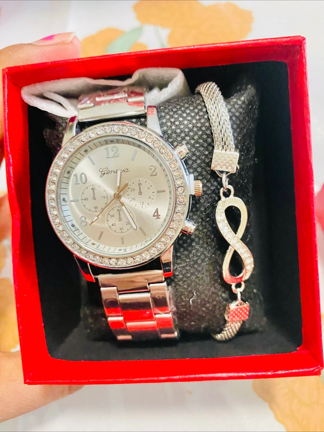 Selling a beautiful Geneva watch and bracelet set. The watch has a silver band and a sparkly face. The bracelet features an infinity symbol charm. It's a stylish set that would look great for any occasion
