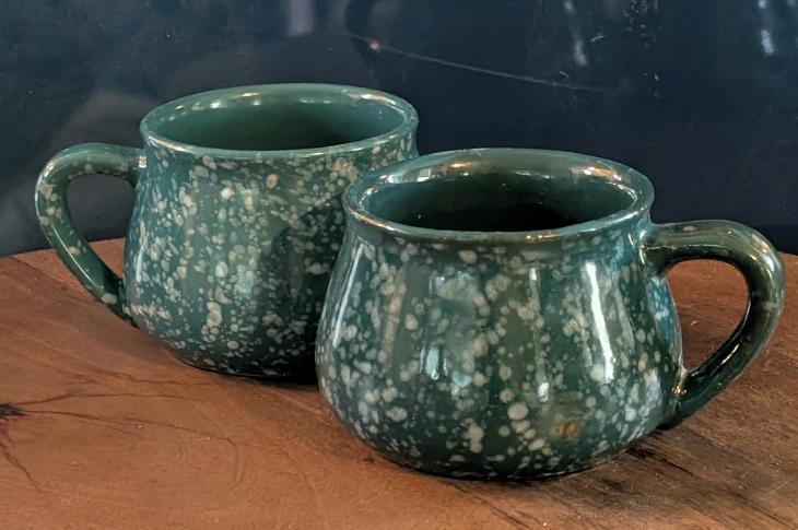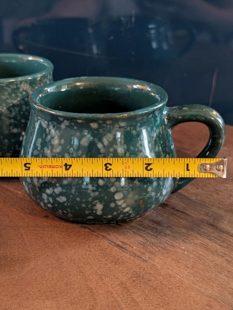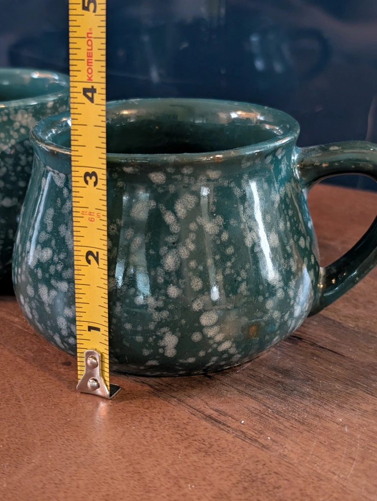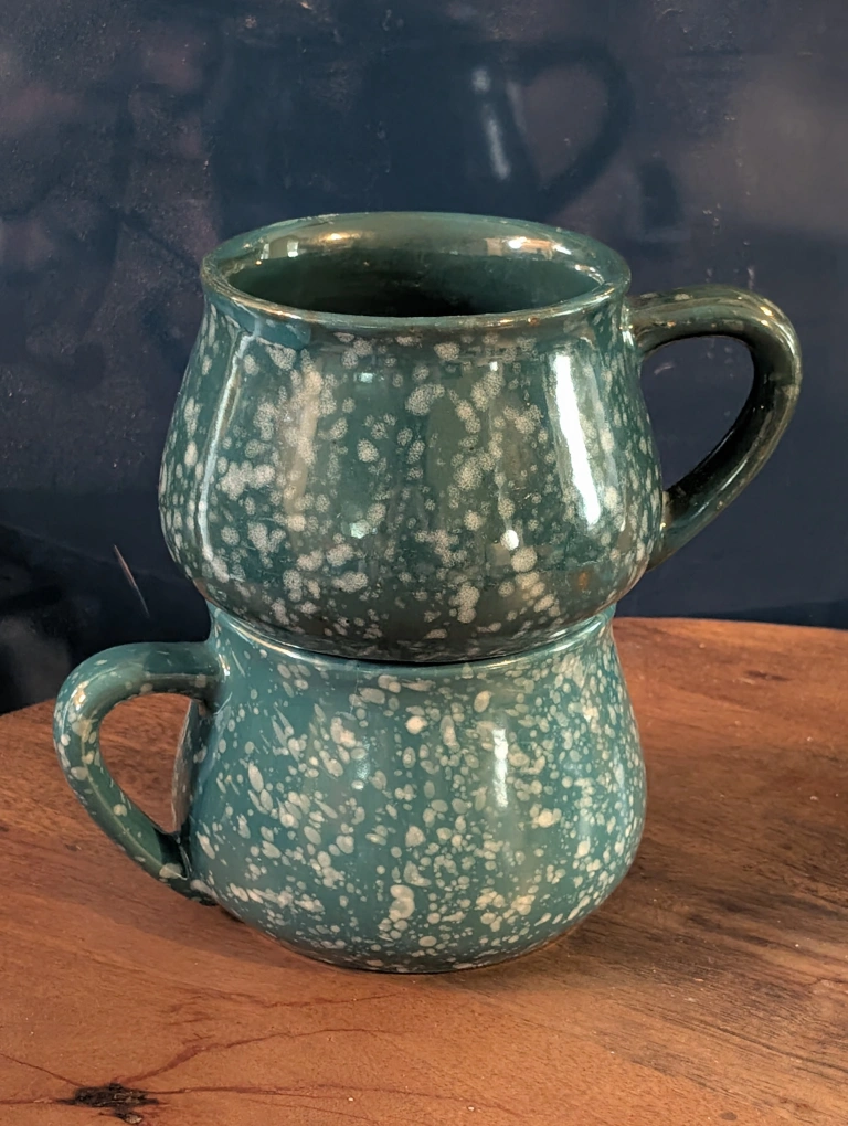 242Selling a set of two mugs in a lovely speckled green colour! They are approximately 4 inches tall and 5 inches wide.