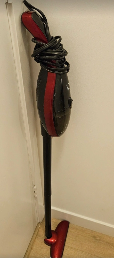 Selling a stick vacuum in red and black by IQ. It's in used condition but still works great for quick cleanups around the house!
